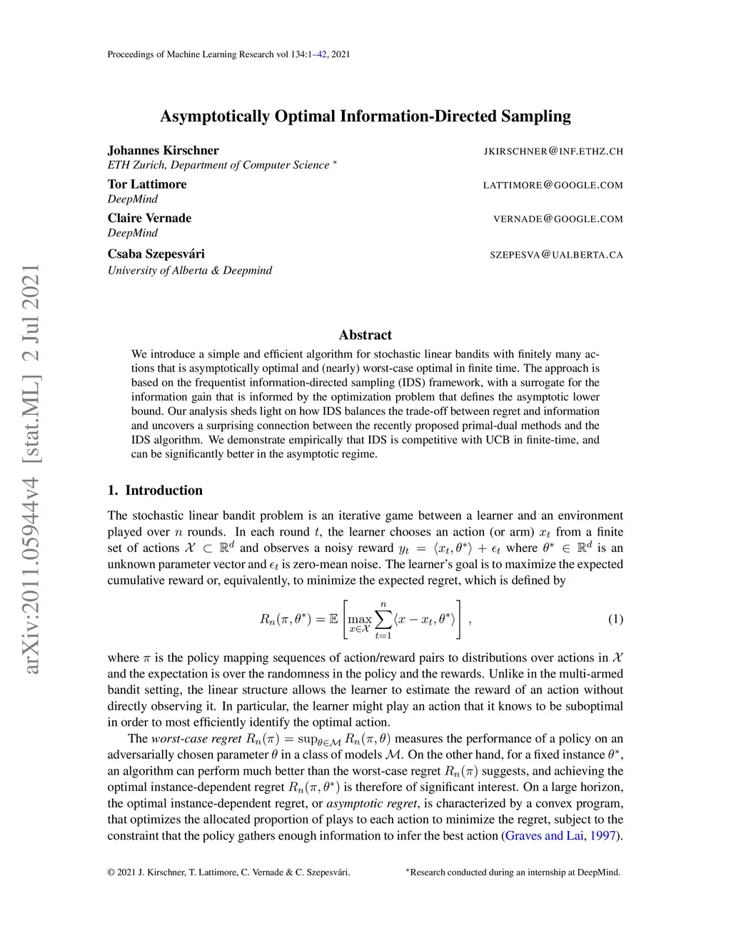 We introduce a simple and efficient algorithm for stochastic linear bandits with finitely many actions that is asymptotically optimal and (nearly) worst-case optimal in finite time. The approach is based on the frequentist information-directed sampling (IDS) framework, with a surrogate for the information gain that is informed by the optimization problem that defines the asymptotic lower bound. Our analysis sheds light on how IDS balances the trade-off between regret and information and uncovers a surprising connection between the recently proposed primal-dual methods and the IDS algorithm. We demonstrate empirically that IDS is competitive with UCB in finite-time, and can be significantly better in the asymptotic regime.