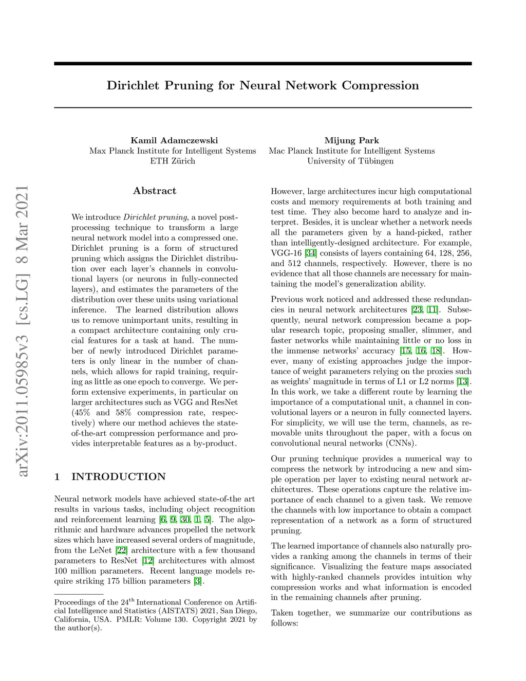 We introduce Dirichlet pruning, a novel post-processing technique to transform a large neural network model into a compressed one. Dirichlet pruning is a form of structured pruning which assigns the Dirichlet distribution over each layer's channels in convolutional layers (or neurons in fully-connected layers), and estimates the parameters of the distribution over these units using variational inference. The learned distribution allows us to remove unimportant units, resulting in a compact architecture containing only crucial features for a task at hand. Our method is extremely fast to train. The number of newly introduced Dirichlet parameters is only linear in the number of channels, which allows for rapid training, requiring as little as one epoch to converge. We perform extensive experiments, in particular on larger architectures such as VGG and WideResNet (45% and 52% compression rate, respectively) where our method achieves the state-of-the-art compression performance and provides interpretable features as a by-product.