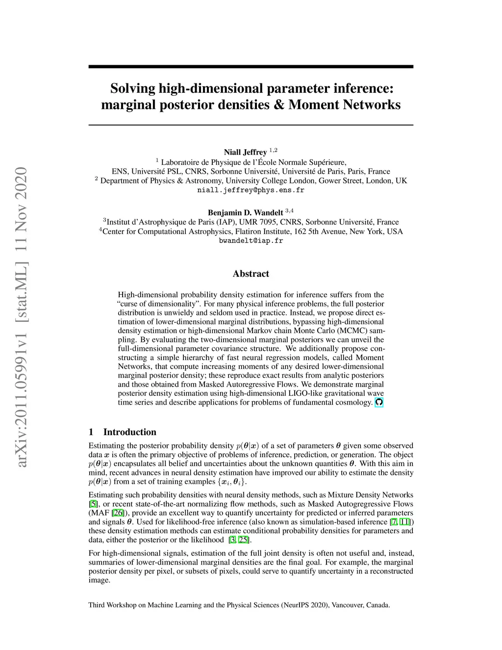 High-dimensional probability density estimation for inference suffers from the "curse of dimensionality". For many physical inference problems, the full posterior distribution is unwieldy and seldom used in practice. Instead, we propose direct estimation of lower-dimensional marginal distributions, bypassing high-dimensional density estimation or high-dimensional Markov chain Monte Carlo (MCMC) sampling. By evaluating the two-dimensional marginal posteriors we can unveil the full-dimensional parameter covariance structure. We additionally propose constructing a simple hierarchy of fast neural regression models, called Moment Networks, that compute increasing moments of any desired lower-dimensional marginal posterior density; these reproduce exact results from analytic posteriors and those obtained from Masked Autoregressive Flows. We demonstrate marginal posterior density estimation using high-dimensional LIGO-like gravitational wave time series and describe applications for problems of fundamental cosmology.