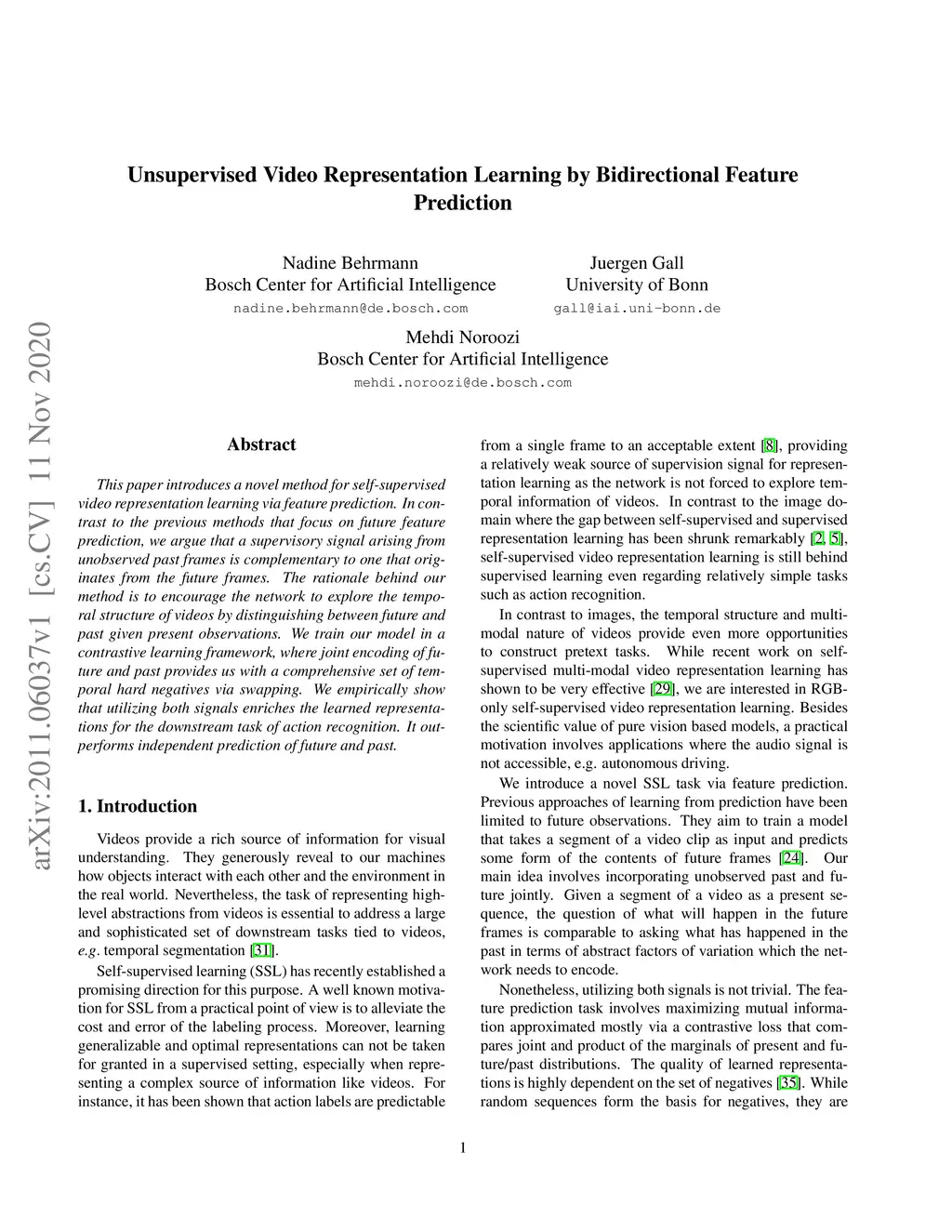 Unsupervised Video Representation Learning by Bidirectional Feature