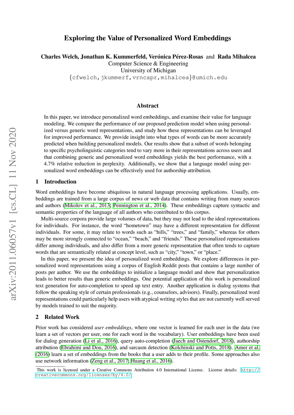 In this paper, we introduce personalized word embeddings, and examine their value for language modeling. We compare the performance of our proposed prediction model when using personalized versus generic word representations, and study how these representations can be leveraged for improved performance. We provide insight into what types of words can be more accurately predicted when building personalized models. Our results show that a subset of words belonging to specific psycholinguistic categories tend to vary more in their representations across users and that combining generic and personalized word embeddings yields the best performance, with a 4.7% relative reduction in perplexity. Additionally, we show that a language model using personalized word embeddings can be effectively used for authorship attribution.