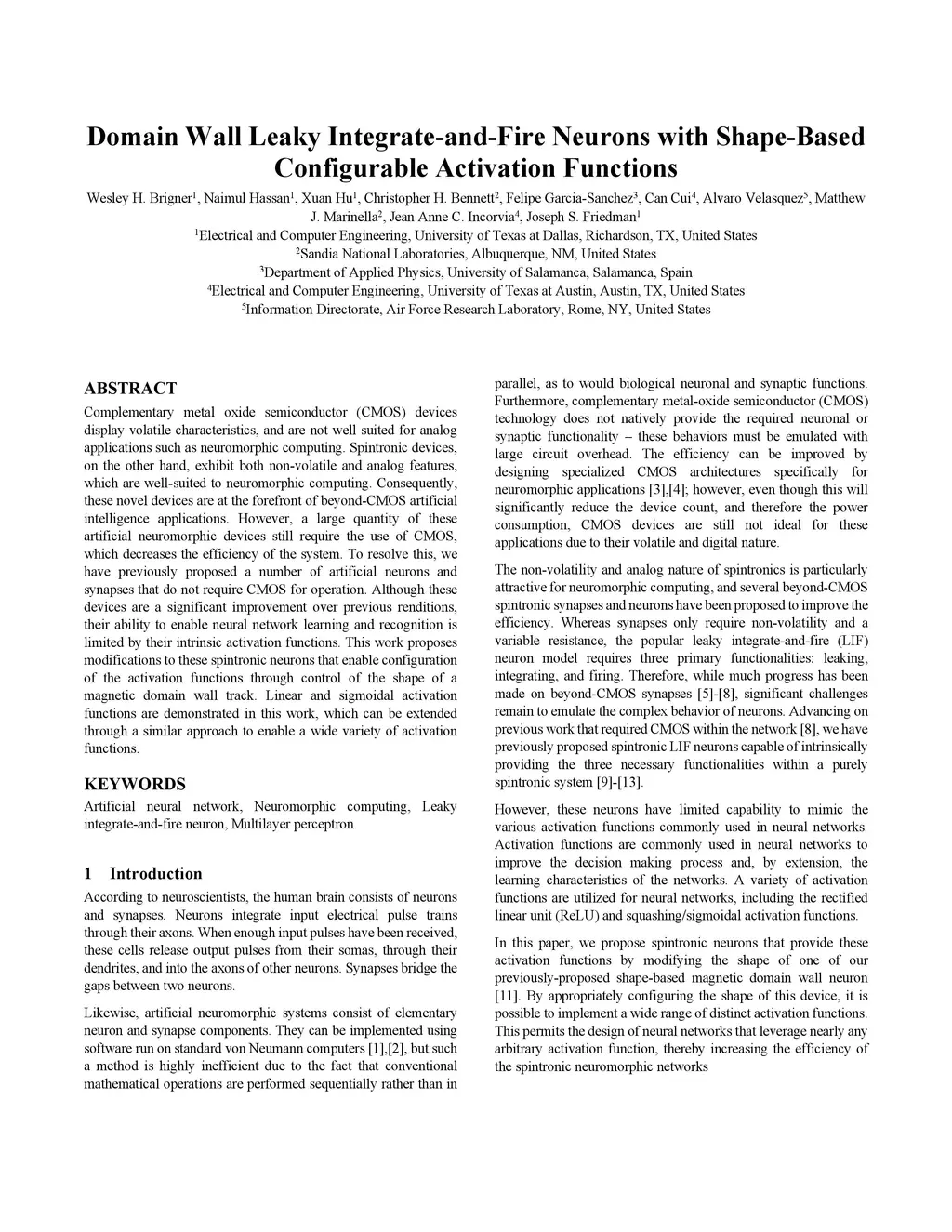 Complementary metal oxide semiconductor (CMOS) devices display volatile characteristics, and are not well suited for analog applications such as neuromorphic computing. Spintronic devices, on the other hand, exhibit both non-volatile and analog features, which are well-suited to neuromorphic computing. Consequently, these novel devices are at the forefront of beyond-CMOS artificial intelligence applications. However, a large quantity of these artificial neuromorphic devices still require the use of CMOS, which decreases the efficiency of the system. To resolve this, we have previously proposed a number of artificial neurons and synapses that do not require CMOS for operation. Although these devices are a significant improvement over previous renditions, their ability to enable neural network learning and recognition is limited by their intrinsic activation functions. This work proposes modifications to these spintronic neurons that enable configuration of the activation functions through control of the shape of a magnetic domain wall track. Linear and sigmoidal activation functions are demonstrated in this work, which can be extended through a similar approach to enable a wide variety of activation functions.