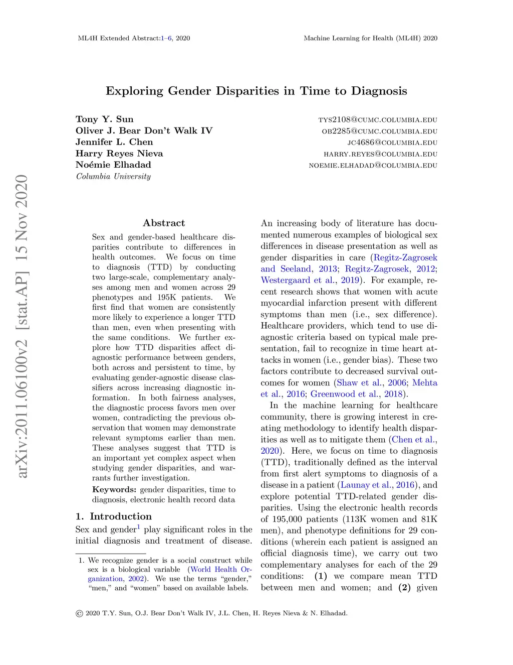 Sex and gender-based healthcare disparities contribute to differences in health outcomes. We focus on time to diagnosis (TTD) by conducting two large-scale, complementary analyses among men and women across 29 phenotypes and 195K patients. We first find that women are consistently more likely to experience a longer TTD than men, even when presenting with the same conditions. We further explore how TTD disparities affect diagnostic performance between genders, both across and persistent to time, by evaluating gender-agnostic disease classifiers across increasing diagnostic information. In both fairness analyses, the diagnostic process favors men over women, contradicting the previous observation that women may demonstrate relevant symptoms earlier than men. These analyses suggest that TTD is an important yet complex aspect when studying gender disparities, and warrants further investigation.