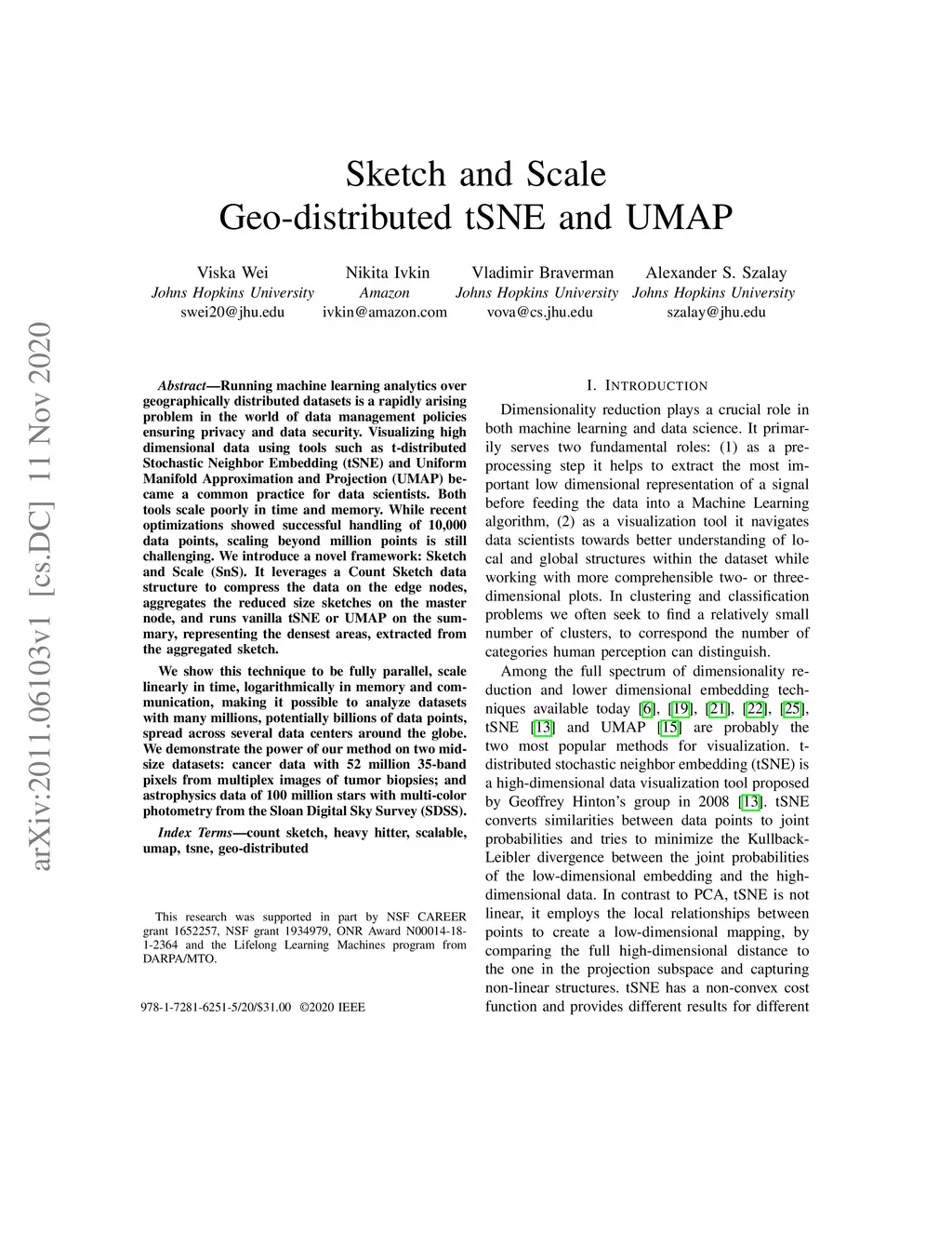 Running machine learning analytics over geographically distributed datasets is a rapidly arising problem in the world of data management policies ensuring privacy and data security. Visualizing high dimensional data using tools such as t-distributed Stochastic Neighbor Embedding (tSNE) and Uniform Manifold Approximation and Projection (UMAP) became common practice for data scientists. Both tools scale poorly in time and memory. While recent optimizations showed successful handling of 10,000 data points, scaling beyond million points is still challenging. We introduce a novel framework: Sketch and Scale (SnS). It leverages a Count Sketch data structure to compress the data on the edge nodes, aggregates the reduced size sketches on the master node, and runs vanilla tSNE or UMAP on the summary, representing the densest areas, extracted from the aggregated sketch. We show this technique to be fully parallel, scale linearly in time, logarithmically in memory, and communication, making it possible to analyze datasets with many millions, potentially billions of data points, spread across several data centers around the globe. We demonstrate the power of our method on two mid-size datasets: cancer data with 52 million 35-band pixels from multiple images of tumor biopsies; and astrophysics data of 100 million stars with multi-color photometry from the Sloan Digital Sky Survey (SDSS).