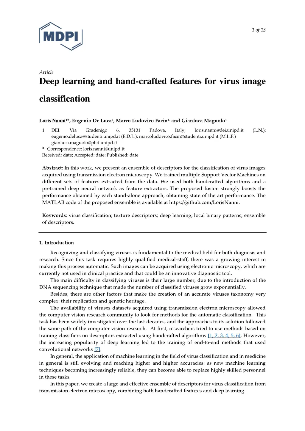In this work, we present an ensemble of descriptors for the classification of transmission electron microscopy images of viruses. We propose to combine handcrafted and deep learning approaches for virus image classification. The set of handcrafted is mainly based on Local Binary Pattern variants, for each descriptor a different Support Vector Machine is trained, then the set of classifiers is combined by sum rule. The deep learning approach is a densenet201 pretrained on ImageNet and then tuned in the virus dataset, the net is used as features extractor for feeding another Support Vector Machine, in particular the last average pooling layer is used as feature extractor. Finally, classifiers trained on handcrafted features and classifier trained on deep learning features are combined by sum rule. The proposed fusion strongly boosts the performance obtained by each stand-alone approach, obtaining state of the art performance.