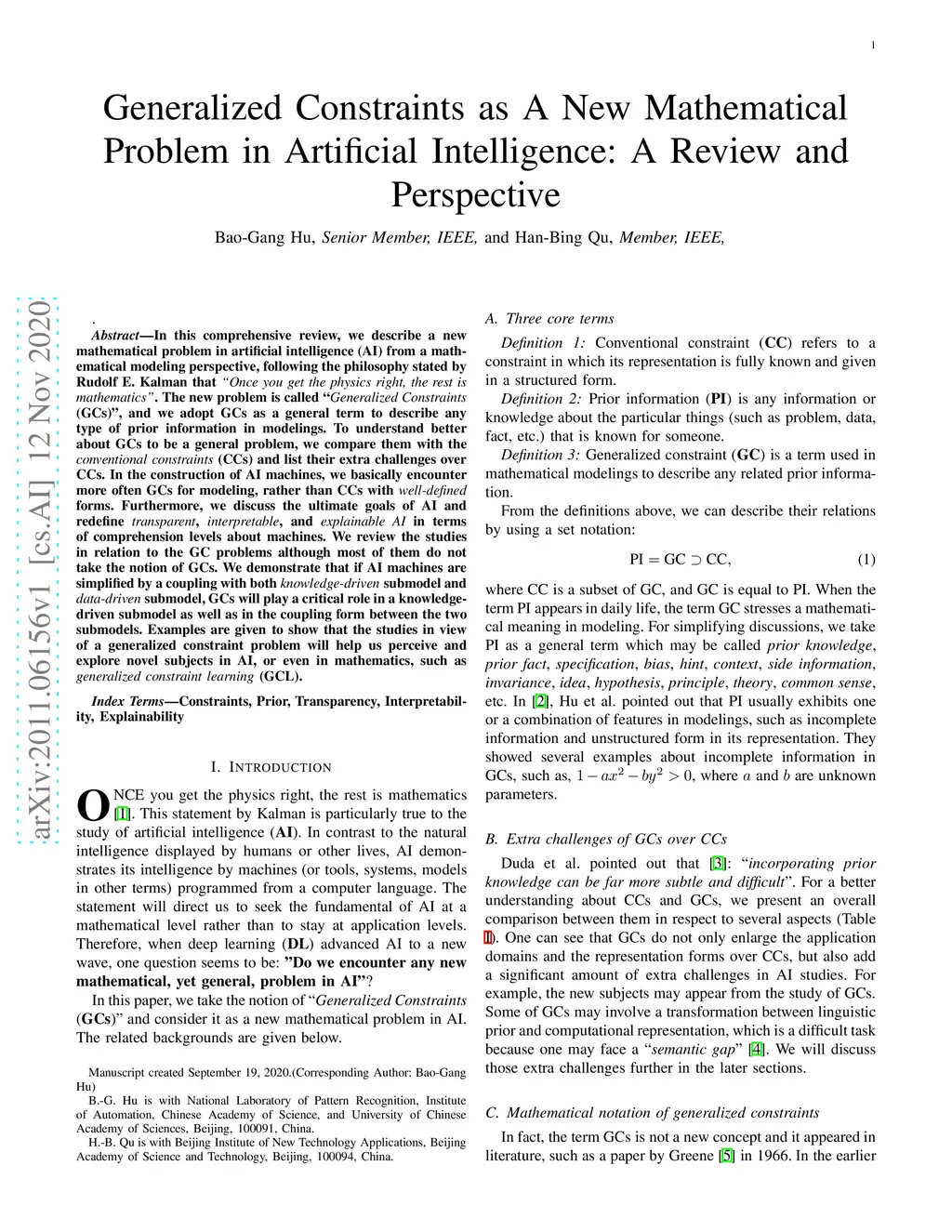 In this comprehensive review, we describe a new mathematical problem in artificial intelligence (AI) from a mathematical modeling perspective, following the philosophy stated by Rudolf E. Kalman that "Once you get the physics right, the rest is mathematics". The new problem is called "Generalized Constraints (GCs)", and we adopt GCs as a general term to describe any type of prior information in modelings. To understand better about GCs to be a general problem, we compare them with the conventional constraints (CCs) and list their extra challenges over CCs. In the construction of AI machines, we basically encounter more often GCs for modeling, rather than CCs with well-defined forms. Furthermore, we discuss the ultimate goals of AI and redefine transparent, interpretable, and explainable AI in terms of comprehension levels about machines. We review the studies in relation to the GC problems although most of them do not take the notion of GCs. We demonstrate that if AI machines are simplified by a coupling with both knowledge-driven submodel and data-driven submodel, GCs will play a critical role in a knowledge-driven submodel as well as in the coupling form between the two submodels. Examples are given to show that the studies in view of a generalized constraint problem will help us perceive and explore novel subjects in AI, or even in mathematics, such as generalized constraint learning (GCL).