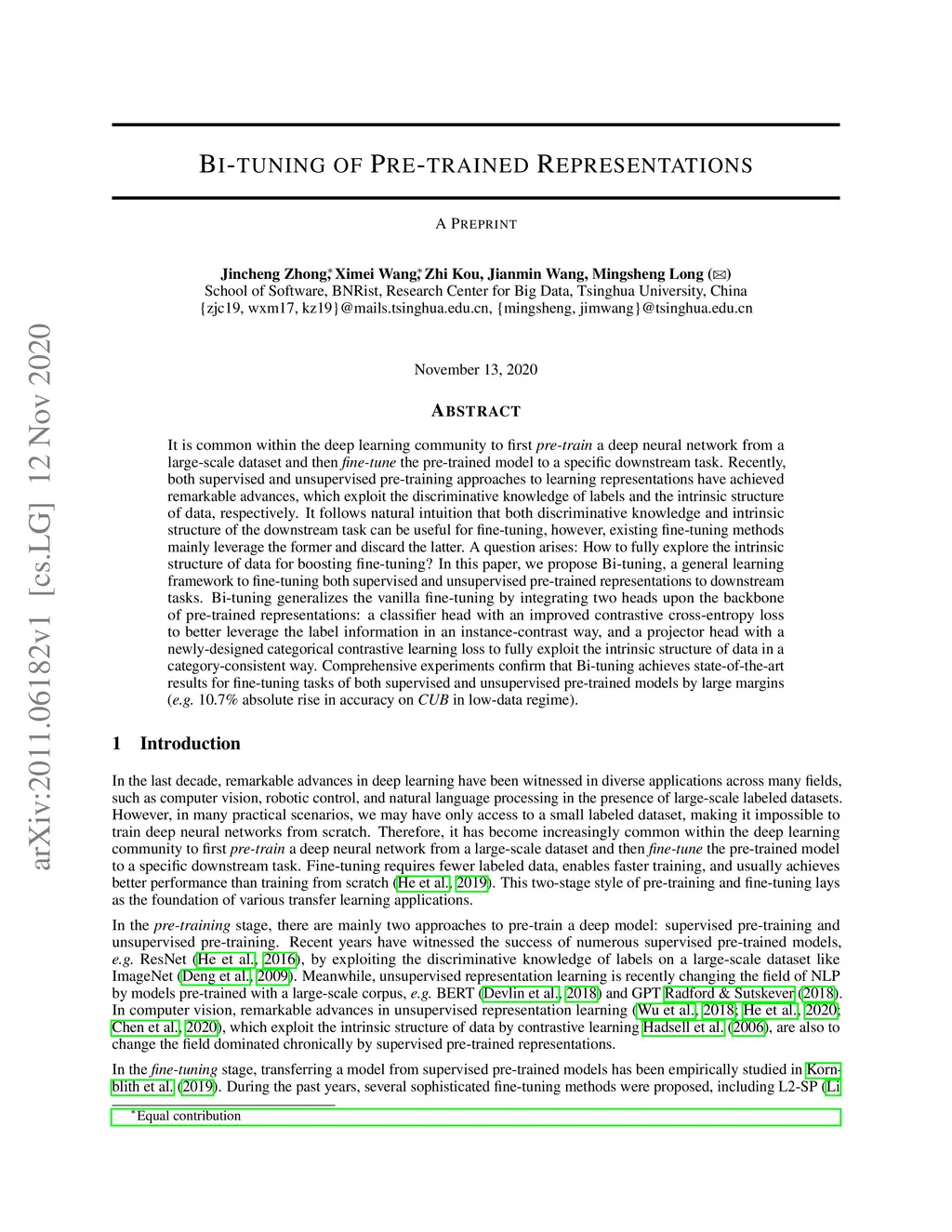 It is common within the deep learning community to first pre-train a deep neural network from a large-scale dataset and then fine-tune the pre-trained model to a specific downstream task. Recently, both supervised and unsupervised pre-training approaches to learning representations have achieved remarkable advances, which exploit the discriminative knowledge of labels and the intrinsic structure of data, respectively. It follows natural intuition that both discriminative knowledge and intrinsic structure of the downstream task can be useful for fine-tuning, however, existing fine-tuning methods mainly leverage the former and discard the latter. A question arises: How to fully explore the intrinsic structure of data for boosting fine-tuning? In this paper, we propose Bi-tuning, a general learning framework to fine-tuning both supervised and unsupervised pre-trained representations to downstream tasks. Bi-tuning generalizes the vanilla fine-tuning by integrating two heads upon the backbone of pre-trained representations: a classifier head with an improved contrastive cross-entropy loss to better leverage the label information in an instance-contrast way, and a projector head with a newly-designed categorical contrastive learning loss to fully exploit the intrinsic structure of data in a category-consistent way. Comprehensive experiments confirm that Bi-tuning achieves state-of-the-art results for fine-tuning tasks of both supervised and unsupervised pre-trained models by large margins (e.g. 10.7\% absolute rise in accuracy on CUB in low-data regime).