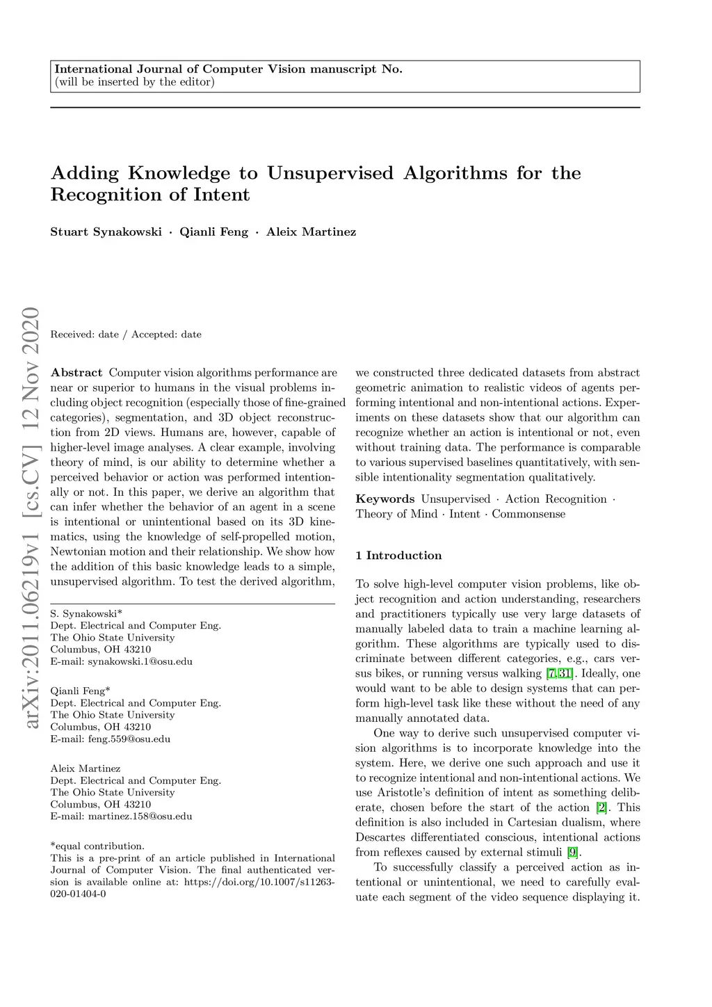 Computer vision algorithms performance are near or superior to humans in the visual problems including object recognition (especially those of fine-grained categories), segmentation, and 3D object reconstruction from 2D views. Humans are, however, capable of higher-level image analyses. A clear example, involving theory of mind, is our ability to determine whether a perceived behavior or action was performed intentionally or not. In this paper, we derive an algorithm that can infer whether the behavior of an agent in a scene is intentional or unintentional based on its 3D kinematics, using the knowledge of self-propelled motion, Newtonian motion and their relationship. We show how the addition of this basic knowledge leads to a simple, unsupervised algorithm. To test the derived algorithm, we constructed three dedicated datasets from abstract geometric animation to realistic videos of agents performing intentional and non-intentional actions. Experiments on these datasets show that our algorithm can recognize whether an action is intentional or not, even without training data. The performance is comparable to various supervised baselines quantitatively, with sensible intentionality segmentation qualitatively.