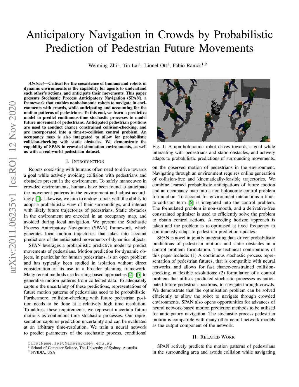 Critical for the coexistence of humans and robots in dynamic environments is the capability for agents to understand each other's actions, and anticipate their movements. This paper presents Stochastic Process Anticipatory Navigation (SPAN), a framework that enables nonholonomic robots to navigate in environments with crowds, while anticipating and accounting for the motion patterns of pedestrians. To this end, we learn a predictive model to predict continuous-time stochastic processes to model future movement of pedestrians. Anticipated pedestrian positions are used to conduct chance constrained collision-checking, and are incorporated into a time-to-collision control problem. An occupancy map is also integrated to allow for probabilistic collision-checking with static obstacles. We demonstrate the capability of SPAN in crowded simulation environments, as well as with a real-world pedestrian dataset.