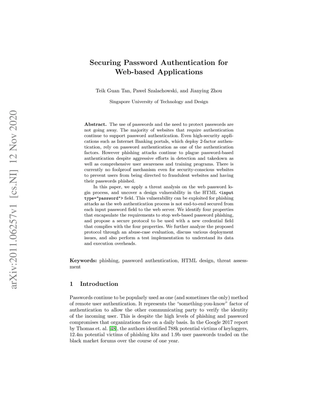 The use of passwords and the need to protect passwords are not going away. The majority of websites that require authentication continue to support password authentication. Even high-security applications such as Internet Banking portals, which deploy 2-factor authentication, rely on password authentication as one of the authentication factors. However phishing attacks continue to plague password-based authentication despite aggressive efforts in detection and takedown as well as comprehensive user awareness and training programs. There is currently no foolproof mechanism even for security-conscious websites to prevent users from being directed to fraudulent websites and having their passwords phished. In this paper, we apply a threat analysis on the web password login process, and uncover a design vulnerability in the HTML<inputtype="password"> field. This vulnerability can be exploited for phishing attacks as the web authentication process is not end-to-end secured from each input password field to the web server. We identify four properties that encapsulate the requirements to stop web-based password phishing, and propose a secure protocol to be used with a new credential field that complies with the four properties. We further analyze the proposed protocol through an abuse-case evaluation, discuss various deployment issues, and also perform a test implementation to understand its data and execution overheads