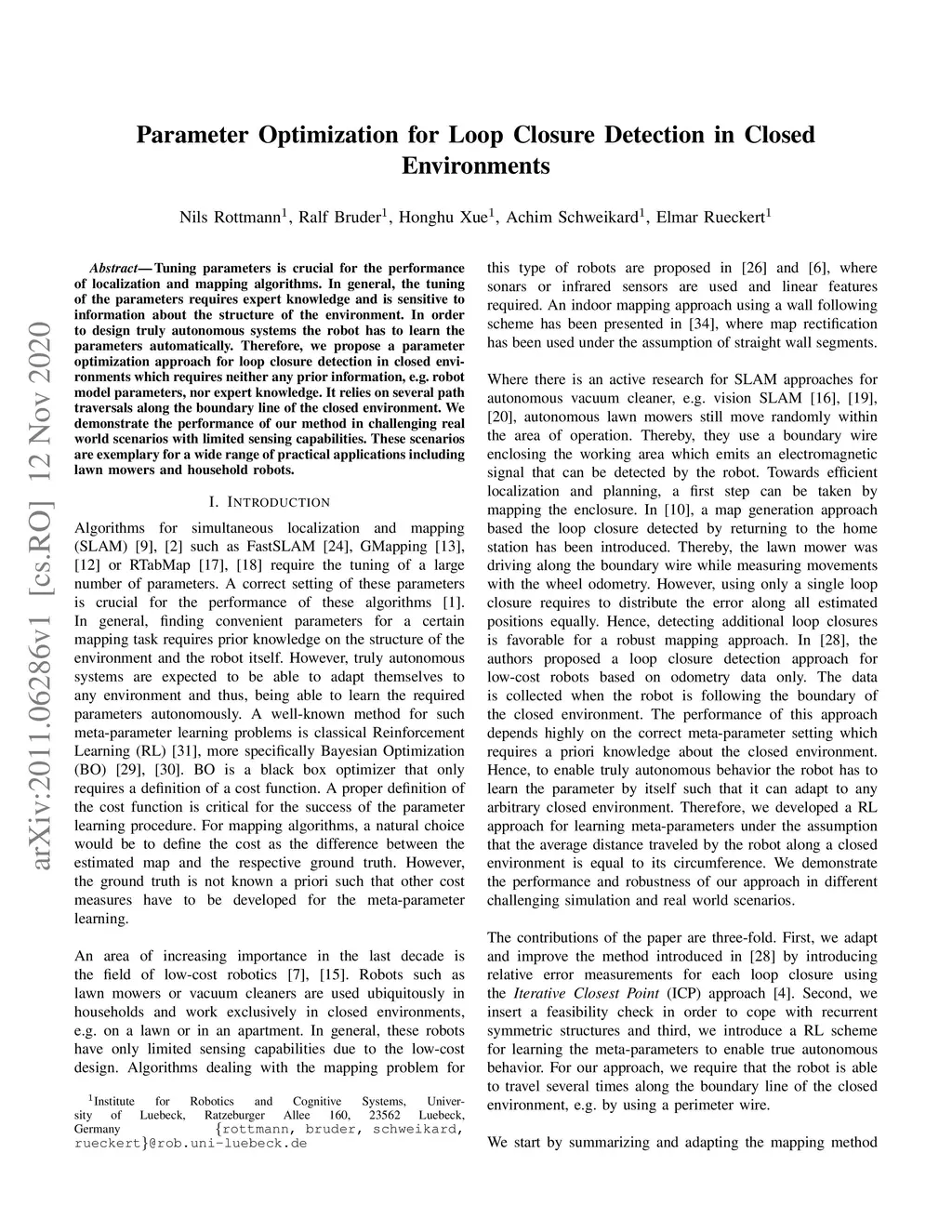 Tuning parameters is crucial for the performance of localization and mapping algorithms. In general, the tuning of the parameters requires expert knowledge and is sensitive to information about the structure of the environment. In order to design truly autonomous systems the robot has to learn the parameters automatically. Therefore, we propose a parameter optimization approach for loop closure detection in closed environments which requires neither any prior information, e.g. robot model parameters, nor expert knowledge. It relies on several path traversals along the boundary line of the closed environment. We demonstrate the performance of our method in challenging real world scenarios with limited sensing capabilities. These scenarios are exemplary for a wide range of practical applications including lawn mowers and household robots.