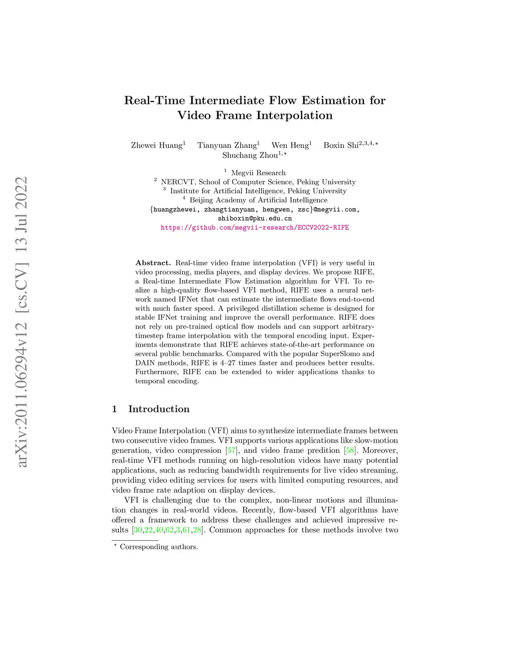 Real-time video frame interpolation (VFI) is very useful in video processing, media players, and display devices. We propose RIFE, a Real-time Intermediate Flow Estimation algorithm for VFI. To realize a high-quality flow-based VFI method, RIFE uses a neural network named IFNet that can estimate the intermediate flows end-to-end with much faster speed. A privileged distillation scheme is designed for stable IFNet training and improve the overall performance. RIFE does not rely on pre-trained optical flow models and can support arbitrary-timestep frame interpolation with the temporal encoding input. Experiments demonstrate that RIFE achieves state-of-the-art performance on several public benchmarks. Compared with the popular SuperSlomo and DAIN methods, RIFE is 4--27 times faster and produces better results. Furthermore, RIFE can be extended to wider applications thanks to temporal encoding. The code is available at https://github.com/megvii-research/ECCV2022-RIFE.