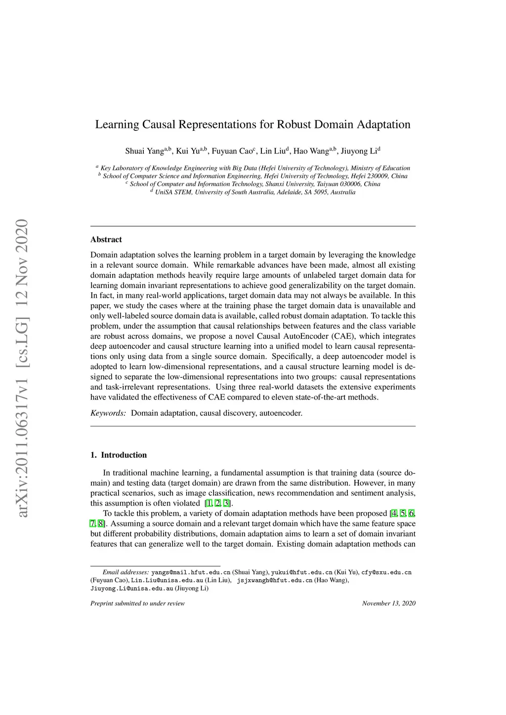 Domain adaptation solves the learning problem in a target domain by leveraging the knowledge in a relevant source domain. While remarkable advances have been made, almost all existing domain adaptation methods heavily require large amounts of unlabeled target domain data for learning domain invariant representations to achieve good generalizability on the target domain. In fact, in many real-world applications, target domain data may not always be available. In this paper, we study the cases where at the training phase the target domain data is unavailable and only well-labeled source domain data is available, called robust domain adaptation. To tackle this problem, under the assumption that causal relationships between features and the class variable are robust across domains, we propose a novel Causal AutoEncoder (CAE), which integrates deep autoencoder and causal structure learning into a unified model to learn causal representations only using data from a single source domain. Specifically, a deep autoencoder model is adopted to learn low-dimensional representations, and a causal structure learning model is designed to separate the low-dimensional representations into two groups: causal representations and task-irrelevant representations. Using three real-world datasets the extensive experiments have validated the effectiveness of CAE compared to eleven state-of-the-art methods.
