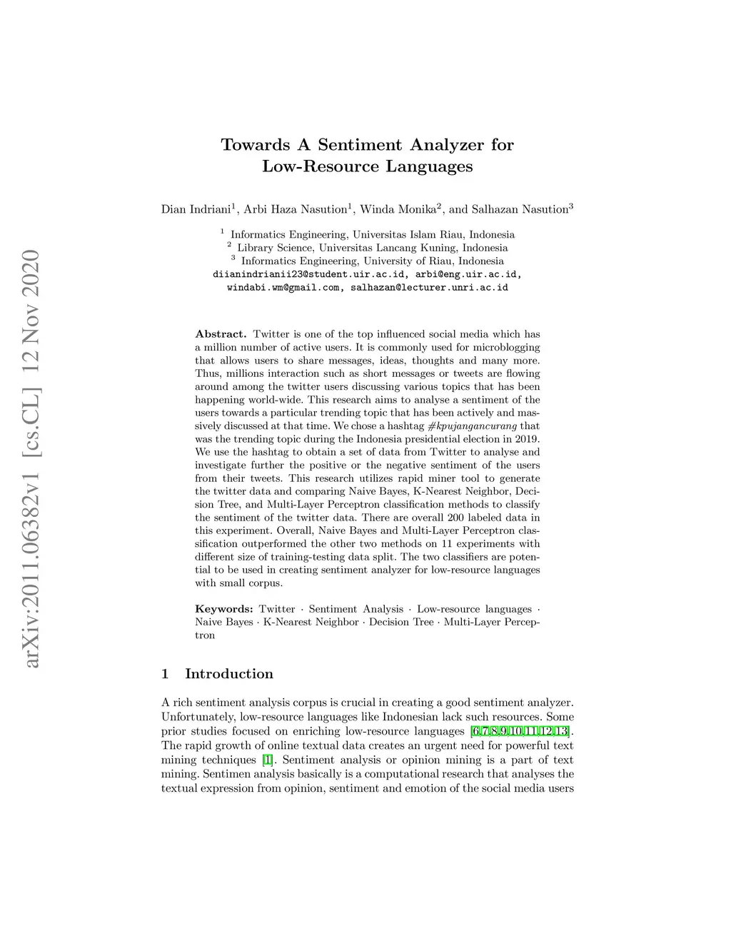 Twitter is one of the top influenced social media which has a million number of active users. It is commonly used for microblogging that allows users to share messages, ideas, thoughts and many more. Thus, millions interaction such as short messages or tweets are flowing around among the twitter users discussing various topics that has been happening world-wide. This research aims to analyse a sentiment of the users towards a particular trending topic that has been actively and massively discussed at that time. We chose a hashtag \textit{\#kpujangancurang} that was the trending topic during the Indonesia presidential election in 2019. We use the hashtag to obtain a set of data from Twitter to analyse and investigate further the positive or the negative sentiment of the users from their tweets. This research utilizes rapid miner tool to generate the twitter data and comparing Naive Bayes, K-Nearest Neighbor, Decision Tree, and Multi-Layer Perceptron classification methods to classify the sentiment of the twitter data. There are overall 200 labeled data in this experiment. Overall, Naive Bayes and Multi-Layer Perceptron classification outperformed the other two methods on 11 experiments with different size of training-testing data split. The two classifiers are potential to be used in creating sentiment analyzer for low-resource languages with small corpus.