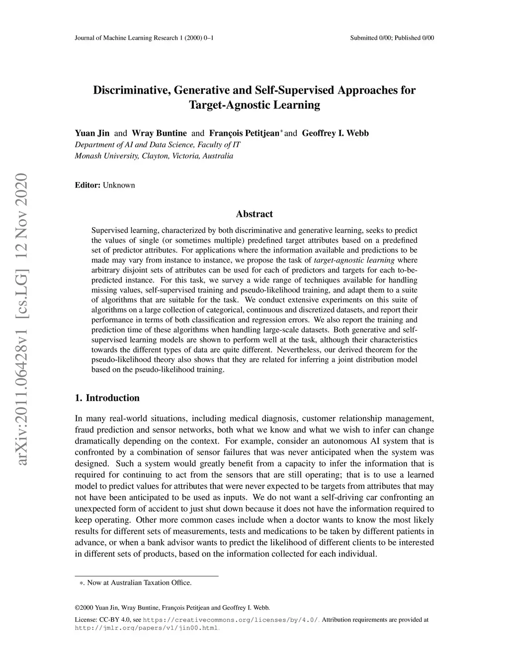 Supervised learning, characterized by both discriminative and generative learning, seeks to predict the values of single (or sometimes multiple) predefined target attributes based on a predefined set of predictor attributes. For applications where the information available and predictions to be made may vary from instance to instance, we propose the task of target-agnostic learning where arbitrary disjoint sets of attributes can be used for each of predictors and targets for each to-be-predicted instance. For this task, we survey a wide range of techniques available for handling missing values, self-supervised training and pseudo-likelihood training, and adapt them to a suite of algorithms that are suitable for the task. We conduct extensive experiments on this suite of algorithms on a large collection of categorical, continuous and discretized datasets, and report their performance in terms of both classification and regression errors. We also report the training and prediction time of these algorithms when handling large-scale datasets. Both generative and self-supervised learning models are shown to perform well at the task, although their characteristics towards the different types of data are quite different. Nevertheless, our derived theorem for the pseudo-likelihood theory also shows that they are related for inferring a joint distribution model based on the pseudo-likelihood training.
