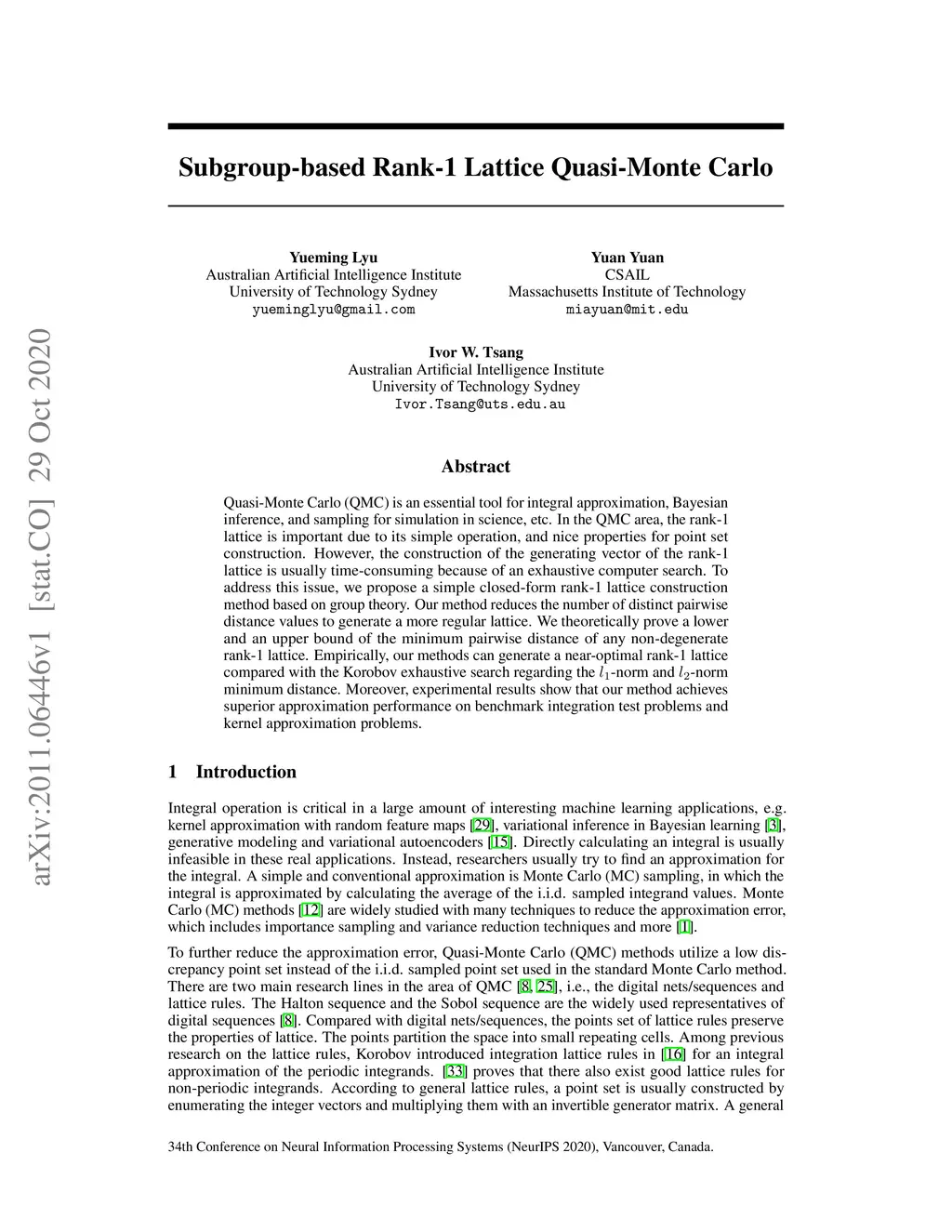 Quasi-Monte Carlo (QMC) is an essential tool for integral approximation, Bayesian inference, and sampling for simulation in science, etc. In the QMC area, the rank-1 lattice is important due to its simple operation, and nice properties for point set construction. However, the construction of the generating vector of the rank-1 lattice is usually time-consuming because of an exhaustive computer search. To address this issue, we propose a simple closed-form rank-1 lattice construction method based on group theory. Our method reduces the number of distinct pairwise distance values to generate a more regular lattice. We theoretically prove a lower and an upper bound of the minimum pairwise distance of any non-degenerate rank-1 lattice. Empirically, our methods can generate a near-optimal rank-1 lattice compared with the Korobov exhaustive search regarding the -norm and -norm minimum distance. Moreover, experimental results show that our method achieves superior approximation performance on benchmark integration test problems and kernel approximation problems.