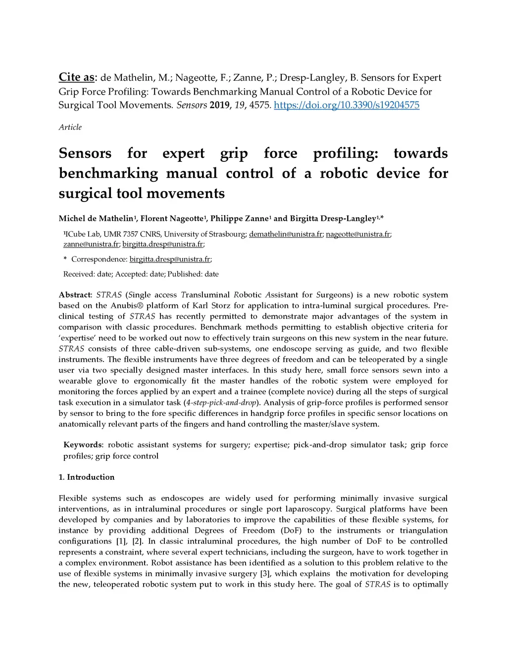 STRAS (Single access Transluminal Robotic Assistant for Surgeons) is a new robotic system for application to intraluminal surgical procedures. Preclinical testing of STRAS has recently permitted to demonstrate major advantages of the system in comparison with classic procedures. Benchmark methods permitting to establish objective criteria for expertise need to be worked out now to effectively train surgeons on this new system in the near future. STRAS consists of three cable driven subsystems, one endoscope serving as guide, and two flexible instruments. The flexible instruments have three degrees of freedom and can be teleoperated by a single user via two specially designed master interfaces. In this study here, small force sensors sewn into a wearable glove to ergonomically fit the master handles of the robotic system were employed for monitoring the forces applied by an expert and a trainee who was a complete novice during all the steps of surgical task execution in a simulator task, a four step pick and drop. Analysis of gripforce profiles is performed sensor by sensor to bring to the fore specific differences in handgrip force profiles in specific sensor locations on anatomically relevant parts of the fingers and hand controlling the master slave system.