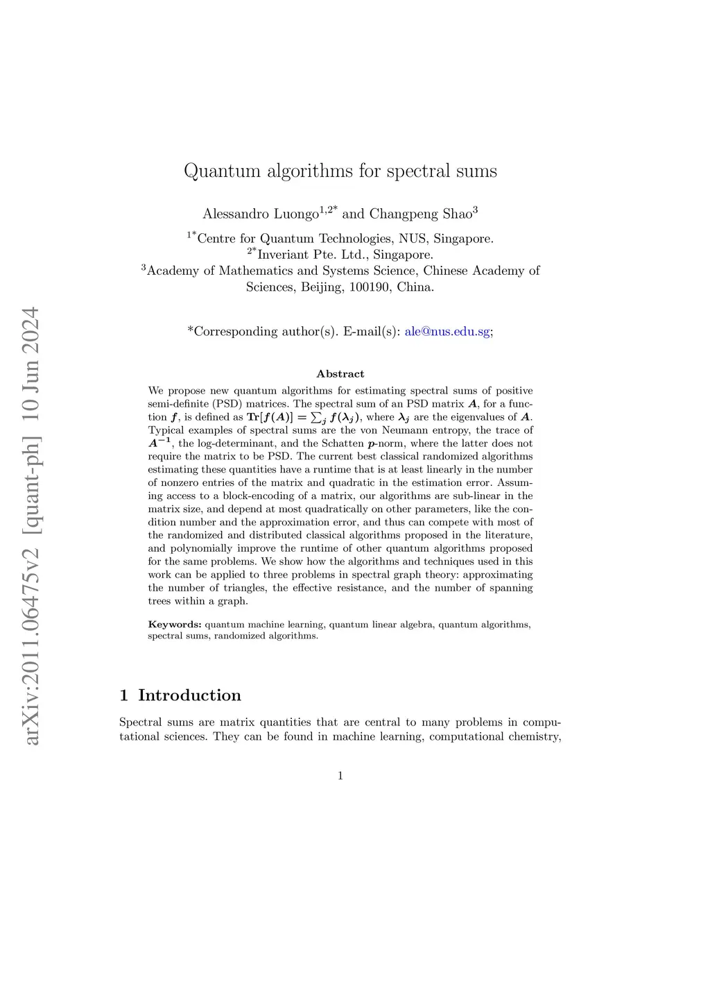 We propose new quantum algorithms for estimating spectral sums of positive semi-definite (PSD) matrices. The spectral sum of an PSD matrix , for a function , is defined as $ \text{Tr}[f(A)] = \sum_j f(\lambda_j)$, where are the eigenvalues of . Typical examples of spectral sums are the von Neumann entropy, the trace of , the log-determinant, and the Schatten -norm, where the latter does not require the matrix to be PSD. The current best classical randomized algorithms estimating these quantities have a runtime that is at least linearly in the number of nonzero entries of the matrix and quadratic in the estimation error. Assuming access to a block-encoding of a matrix, our algorithms are sub-linear in the matrix size, and depend at most quadratically on other parameters, like the condition number and the approximation error, and thus can compete with most of the randomized and distributed classical algorithms proposed in the literature, and polynomially improve the runtime of other quantum algorithms proposed for the same problems. We show how the algorithms and techniques used in this work can be applied to three problems in spectral graph theory: approximating the number of triangles, the effective resistance, and the number of spanning trees within a graph.