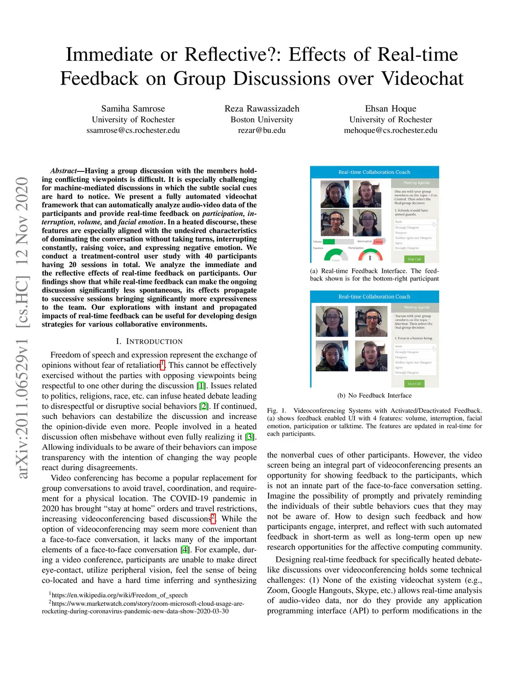 Having a group discussion with the members holding conflicting viewpoints is difficult. It is especially challenging for machine-mediated discussions in which the subtle social cues are hard to notice. We present a fully automated videochat framework that can automatically analyze audio-video data of the participants and provide real-time feedback on participation, interruption, volume, and facial emotion. In a heated discourse, these features are especially aligned with the undesired characteristics of dominating the conversation without taking turns, interrupting constantly, raising voice, and expressing negative emotion. We conduct a treatment-control user study with 40 participants having 20 sessions in total. We analyze the immediate and the reflective effects of real-time feedback on participants. Our findings show that while real-time feedback can make the ongoing discussion significantly less spontaneous, its effects propagate to successive sessions bringing significantly more expressiveness to the team. Our explorations with instant and propagated impacts of real-time feedback can be useful for developing design strategies for various collaborative environments.