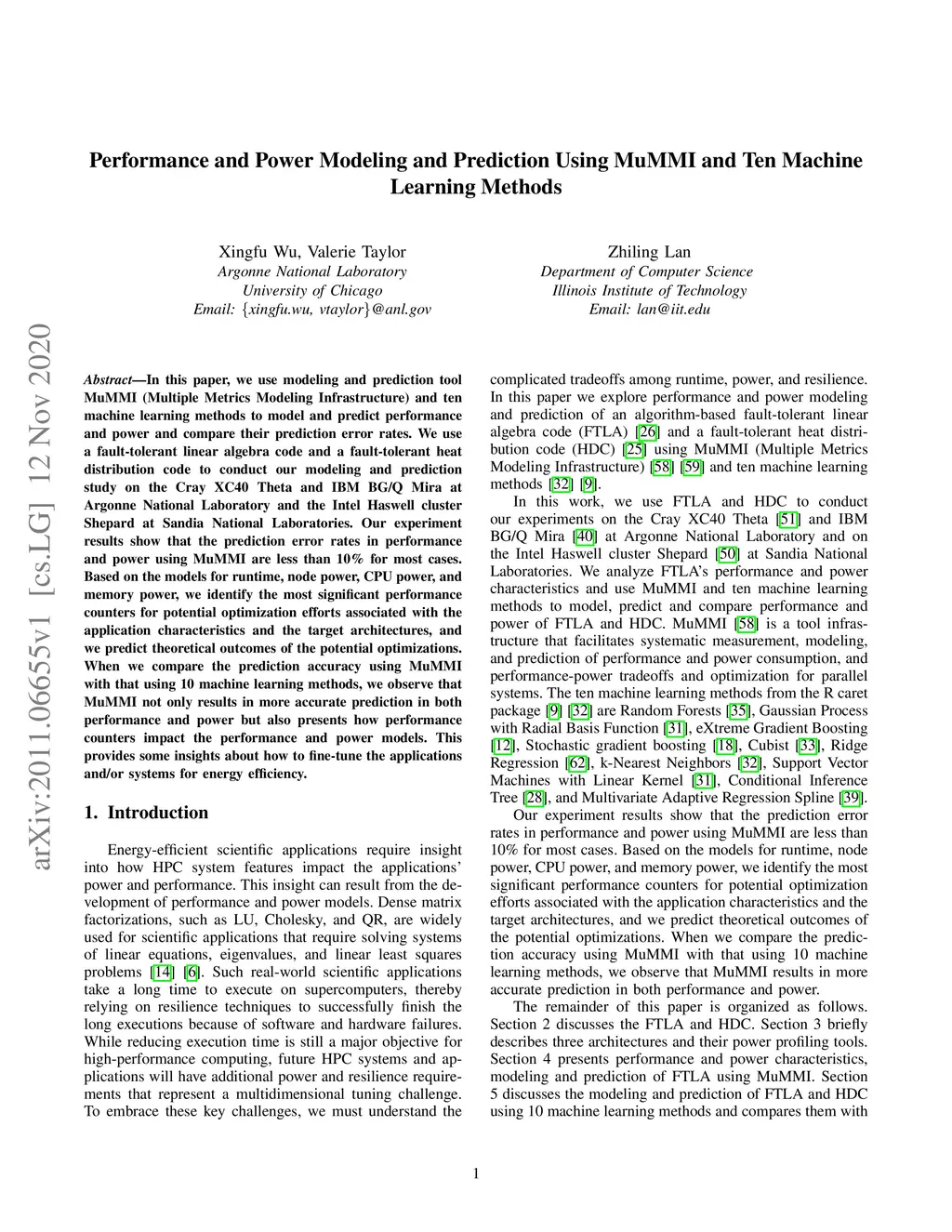 In this paper, we use modeling and prediction tool MuMMI (Multiple Metrics Modeling Infrastructure) and ten machine learning methods to model and predict performance and power and compare their prediction error rates. We use a fault-tolerant linear algebra code and a fault-tolerant heat distribution code to conduct our modeling and prediction study on the Cray XC40 Theta and IBM BG/Q Mira at Argonne National Laboratory and the Intel Haswell cluster Shepard at Sandia National Laboratories. Our experiment results show that the prediction error rates in performance and power using MuMMI are less than 10% for most cases. Based on the models for runtime, node power, CPU power, and memory power, we identify the most significant performance counters for potential optimization efforts associated with the application characteristics and the target architectures, and we predict theoretical outcomes of the potential optimizations. When we compare the prediction accuracy using MuMMI with that using 10 machine learning methods, we observe that MuMMI not only results in more accurate prediction in both performance and power but also presents how performance counters impact the performance and power models. This provides some insights about how to fine-tune the applications and/or systems for energy efficiency.