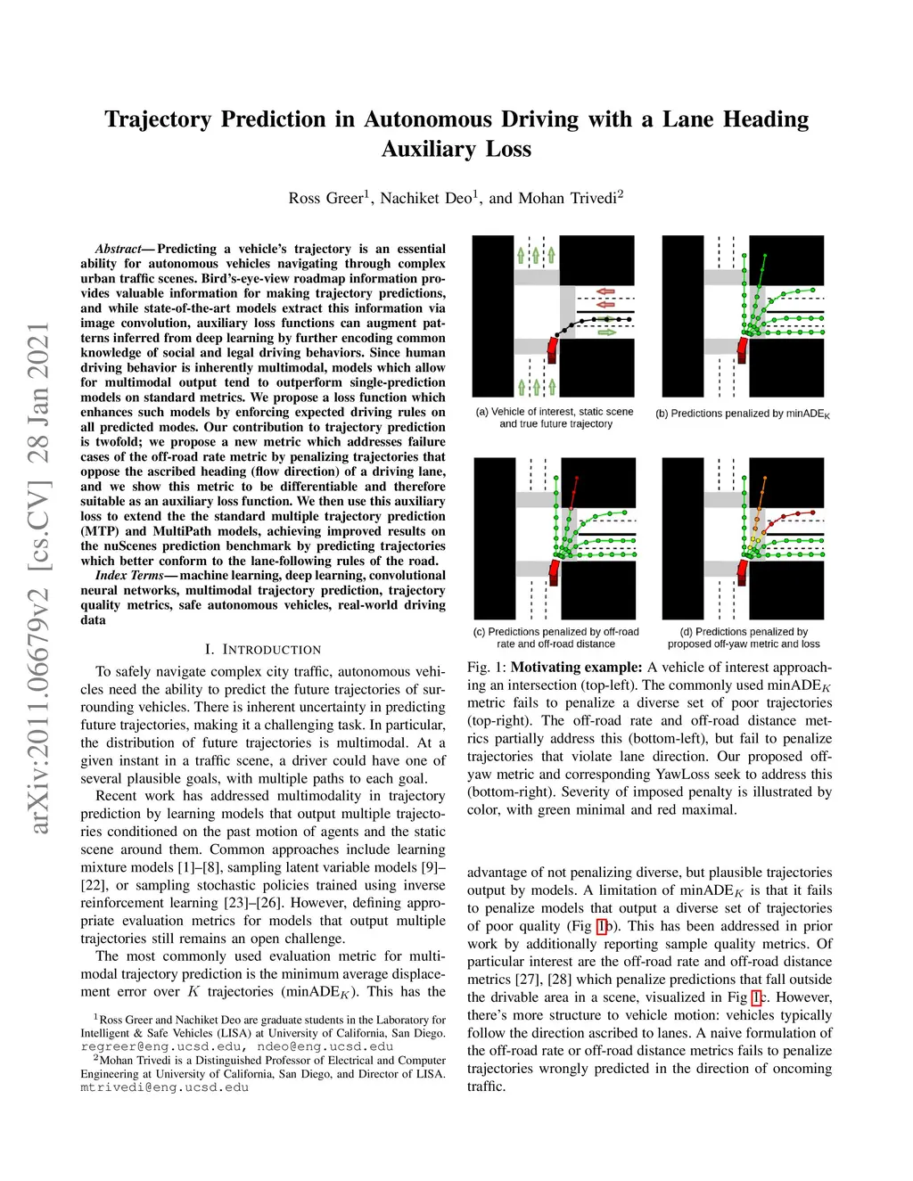 Predicting a vehicle's trajectory is an essential ability for autonomous vehicles navigating through complex urban traffic scenes. Bird's-eye-view roadmap information provides valuable information for making trajectory predictions, and while state-of-the-art models extract this information via image convolution, auxiliary loss functions can augment patterns inferred from deep learning by further encoding common knowledge of social and legal driving behaviors. Since human driving behavior is inherently multimodal, models which allow for multimodal output tend to outperform single-prediction models on standard metrics. We propose a loss function which enhances such models by enforcing expected driving rules on all predicted modes. Our contribution to trajectory prediction is twofold; we propose a new metric which addresses failure cases of the off-road rate metric by penalizing trajectories that oppose the ascribed heading (flow direction) of a driving lane, and we show this metric to be differentiable and therefore suitable as an auxiliary loss function. We then use this auxiliary loss to extend the the standard multiple trajectory prediction (MTP) and MultiPath models, achieving improved results on the nuScenes prediction benchmark by predicting trajectories which better conform to the lane-following rules of the road.