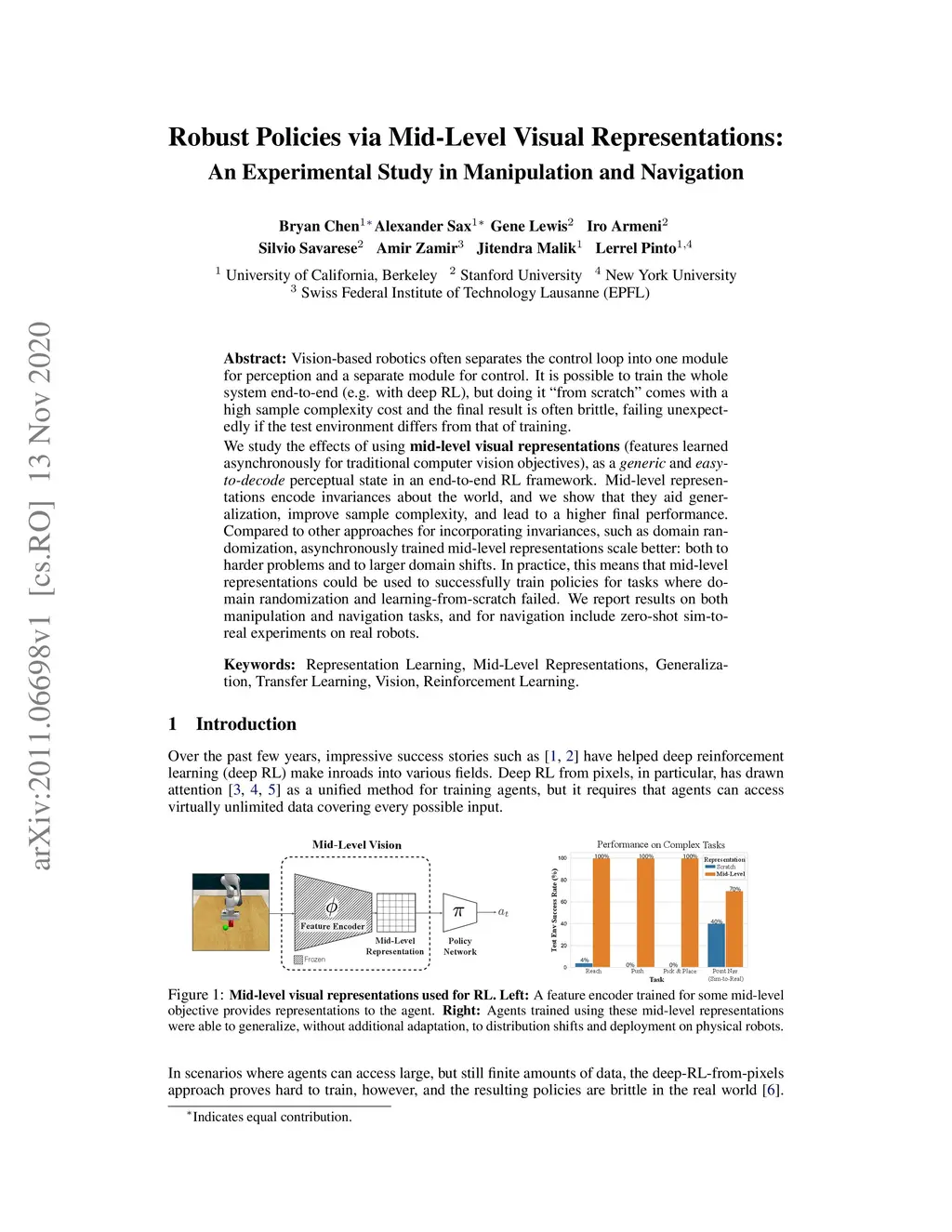 Vision-based robotics often separates the control loop into one module for perception and a separate module for control. It is possible to train the whole system end-to-end (e.g. with deep RL), but doing it "from scratch" comes with a high sample complexity cost and the final result is often brittle, failing unexpectedly if the test environment differs from that of training. We study the effects of using mid-level visual representations (features learned asynchronously for traditional computer vision objectives), as a generic and easy-to-decode perceptual state in an end-to-end RL framework. Mid-level representations encode invariances about the world, and we show that they aid generalization, improve sample complexity, and lead to a higher final performance. Compared to other approaches for incorporating invariances, such as domain randomization, asynchronously trained mid-level representations scale better: both to harder problems and to larger domain shifts. In practice, this means that mid-level representations could be used to successfully train policies for tasks where domain randomization and learning-from-scratch failed. We report results on both manipulation and navigation tasks, and for navigation include zero-shot sim-to-real experiments on real robots.