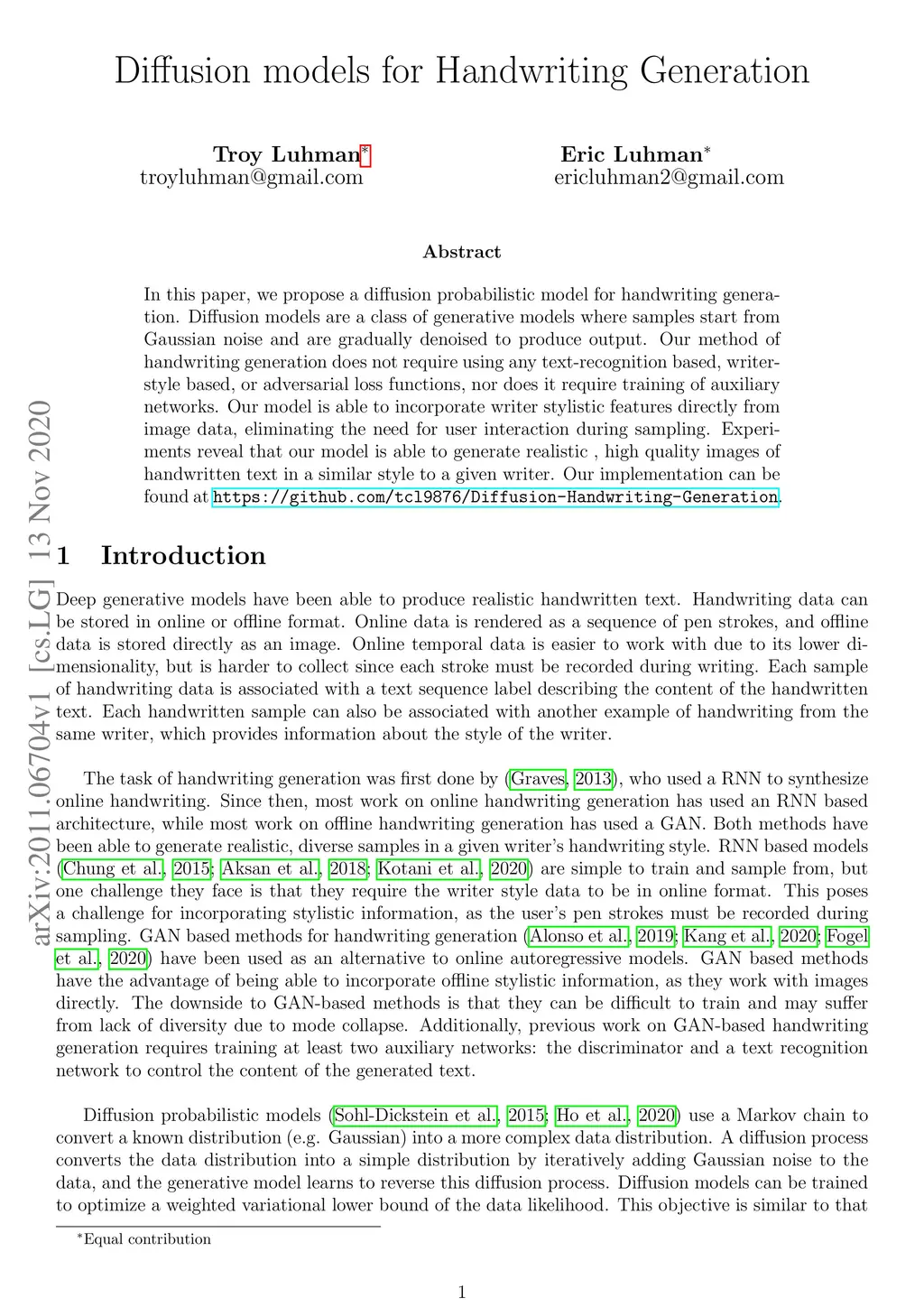Diffusion models for Handwriting Generation
