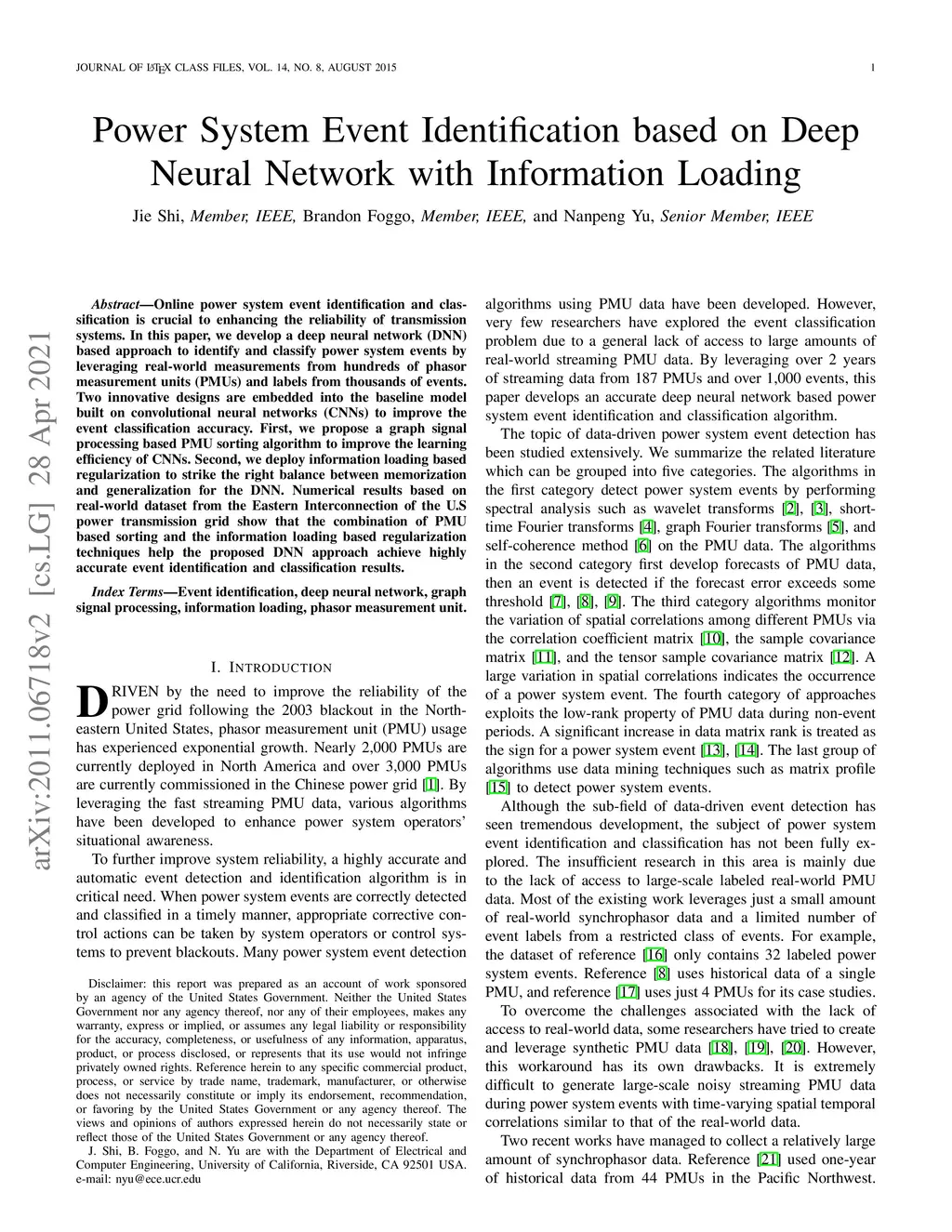 Online power system event identification and classification is crucial to enhancing the reliability of transmission systems. In this paper, we develop a deep neural network (DNN) based approach to identify and classify power system events by leveraging real-world measurements from hundreds of phasor measurement units (PMUs) and labels from thousands of events. Two innovative designs are embedded into the baseline model built on convolutional neural networks (CNNs) to improve the event classification accuracy. First, we propose a graph signal processing based PMU sorting algorithm to improve the learning efficiency of CNNs. Second, we deploy information loading based regularization to strike the right balance between memorization and generalization for the DNN. Numerical studies results based on real-world dataset from the Eastern Interconnection of the U.S power transmission grid show that the combination of PMU based sorting and the information loading based regularization techniques help the proposed DNN approach achieve highly accurate event identification and classification results.