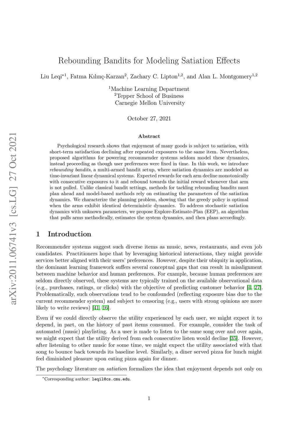 Psychological research shows that enjoyment of many goods is subject to satiation, with short-term satisfaction declining after repeated exposures to the same item. Nevertheless, proposed algorithms for powering recommender systems seldom model these dynamics, instead proceeding as though user preferences were fixed in time. In this work, we introduce rebounding bandits, a multi-armed bandit setup, where satiation dynamics are modeled as time-invariant linear dynamical systems. Expected rewards for each arm decline monotonically with consecutive exposures to it and rebound towards the initial reward whenever that arm is not pulled. Unlike classical bandit settings, methods for tackling rebounding bandits must plan ahead and model-based methods rely on estimating the parameters of the satiation dynamics. We characterize the planning problem, showing that the greedy policy is optimal when the arms exhibit identical deterministic dynamics. To address stochastic satiation dynamics with unknown parameters, we propose Explore-Estimate-Plan (EEP), an algorithm that pulls arms methodically, estimates the system dynamics, and then plans accordingly.