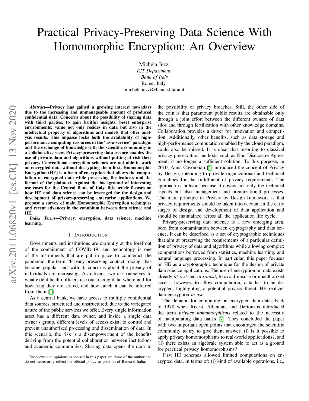 Privacy has gained a growing interest nowadays due to the increasing and unmanageable amount of produced confidential data. Concerns about the possibility of sharing data with third parties, to gain fruitful insights, beset enterprise environments; value not only resides in data but also in the intellectual property of algorithms and models that offer analysis results. This impasse locks both the availability of high-performance computing resources in the "as-a-service" paradigm and the exchange of knowledge with the scientific community in a collaborative view. Privacy-preserving data science enables the use of private data and algorithms without putting at risk their privacy. Conventional encryption schemes are not able to work on encrypted data without decrypting them first. Homomorphic Encryption (HE) is a form of encryption that allows the computation of encrypted data while preserving the features and the format of the plaintext. Against the background of interesting use cases for the Central Bank of Italy, this article focuses on how HE and data science can be leveraged for the design and development of privacy-preserving enterprise applications. We propose a survey of main Homomorphic Encryption techniques and recent advances in the conubium between data science and HE.