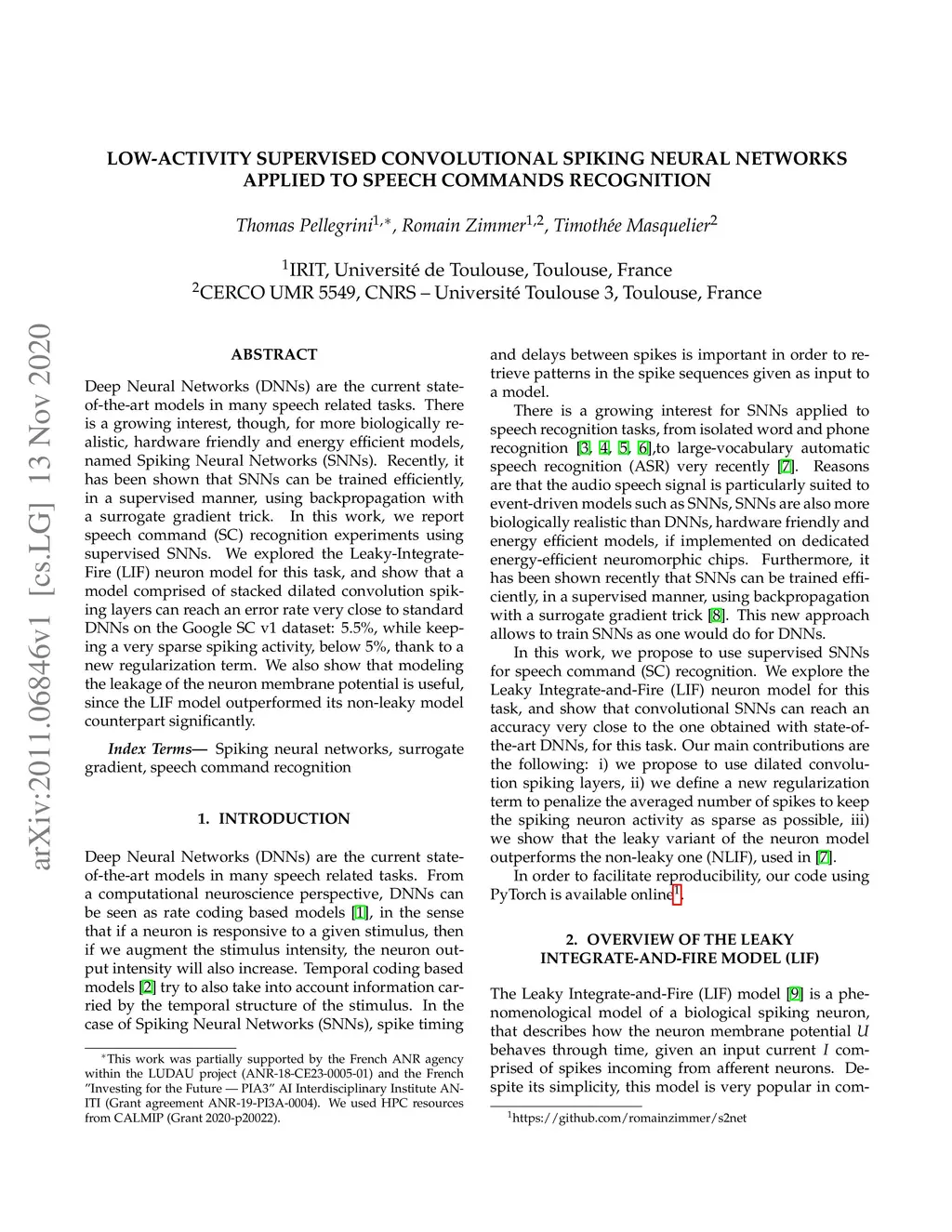 Deep Neural Networks (DNNs) are the current state-of-the-art models in many speech related tasks. There is a growing interest, though, for more biologically realistic, hardware friendly and energy efficient models, named Spiking Neural Networks (SNNs). Recently, it has been shown that SNNs can be trained efficiently, in a supervised manner, using backpropagation with a surrogate gradient trick. In this work, we report speech command (SC) recognition experiments using supervised SNNs. We explored the Leaky-Integrate-Fire (LIF) neuron model for this task, and show that a model comprised of stacked dilated convolution spiking layers can reach an error rate very close to standard DNNs on the Google SC v1 dataset: 5.5%, while keeping a very sparse spiking activity, below 5%, thank to a new regularization term. We also show that modeling the leakage of the neuron membrane potential is useful, since the LIF model outperformed its non-leaky model counterpart significantly.