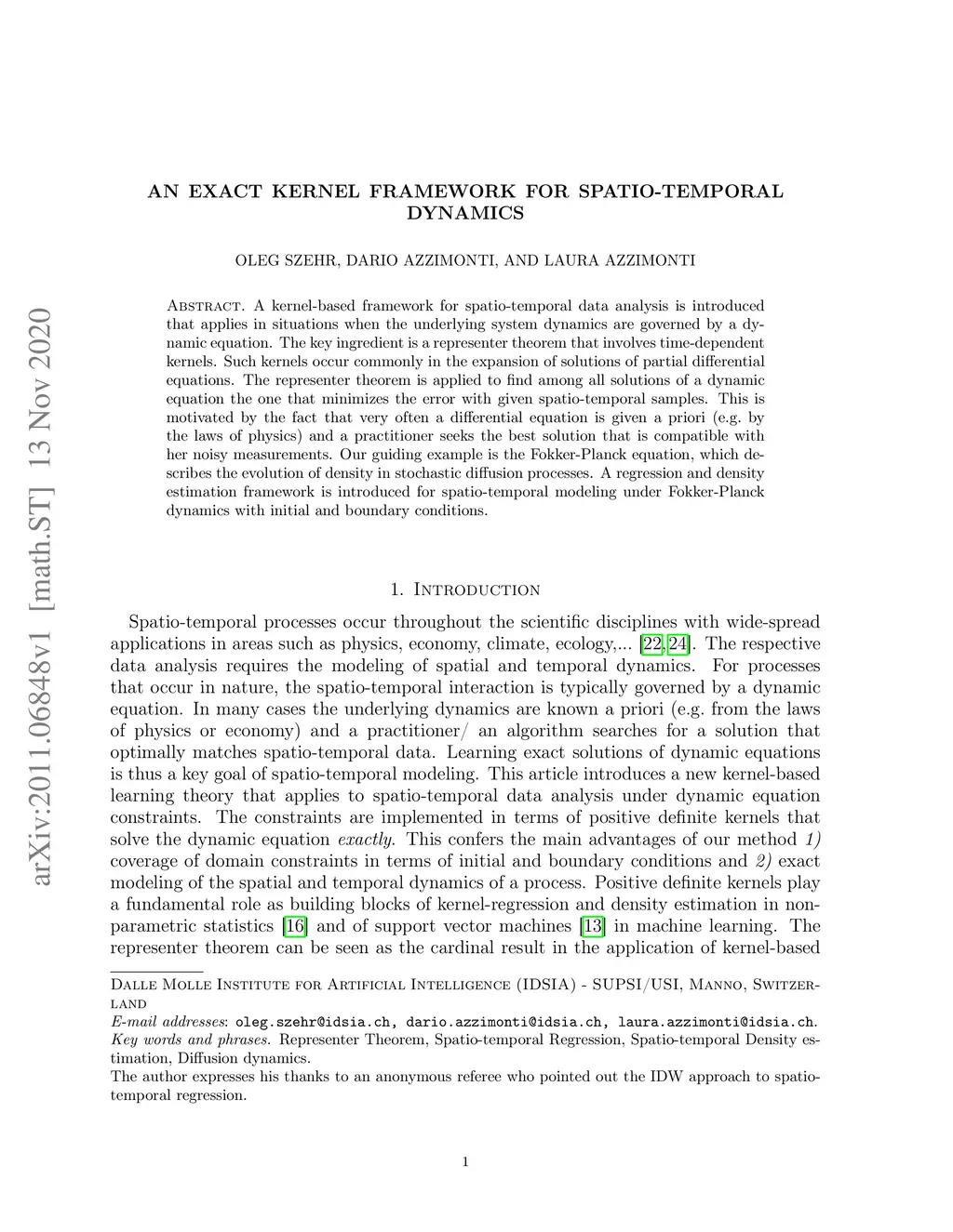 A kernel-based framework for spatio-temporal data analysis is introduced that applies in situations when the underlying system dynamics are governed by a dynamic equation. The key ingredient is a representer theorem that involves time-dependent kernels. Such kernels occur commonly in the expansion of solutions of partial differential equations. The representer theorem is applied to find among all solutions of a dynamic equation the one that minimizes the error with given spatio-temporal samples. This is motivated by the fact that very often a differential equation is given a priori (e.g.~by the laws of physics) and a practitioner seeks the best solution that is compatible with her noisy measurements. Our guiding example is the Fokker-Planck equation, which describes the evolution of density in stochastic diffusion processes. A regression and density estimation framework is introduced for spatio-temporal modeling under Fokker-Planck dynamics with initial and boundary conditions.