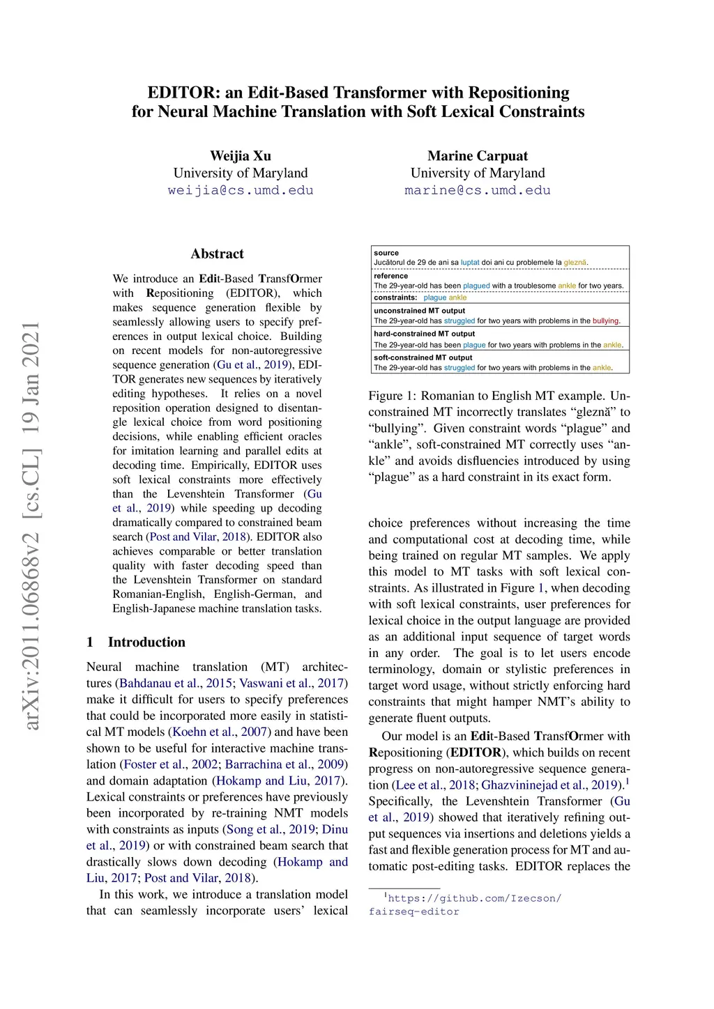 EDITOR: an Edit-Based Transformer with Repositioning for Neural Machine
