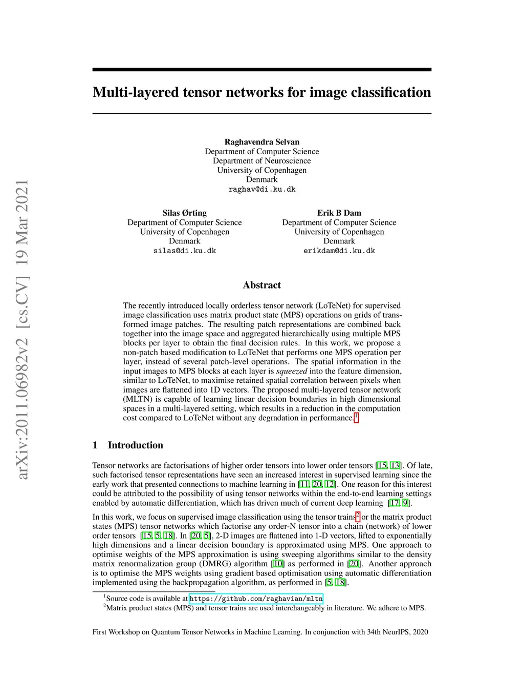 The recently introduced locally orderless tensor network (LoTeNet) for supervised image classification uses matrix product state (MPS) operations on grids of transformed image patches. The resulting patch representations are combined back together into the image space and aggregated hierarchically using multiple MPS blocks per layer to obtain the final decision rules. In this work, we propose a non-patch based modification to LoTeNet that performs one MPS operation per layer, instead of several patch-level operations. The spatial information in the input images to MPS blocks at each layer is squeezed into the feature dimension, similar to LoTeNet, to maximise retained spatial correlation between pixels when images are flattened into 1D vectors. The proposed multi-layered tensor network (MLTN) is capable of learning linear decision boundaries in high dimensional spaces in a multi-layered setting, which results in a reduction in the computation cost compared to LoTeNet without any degradation in performance.
