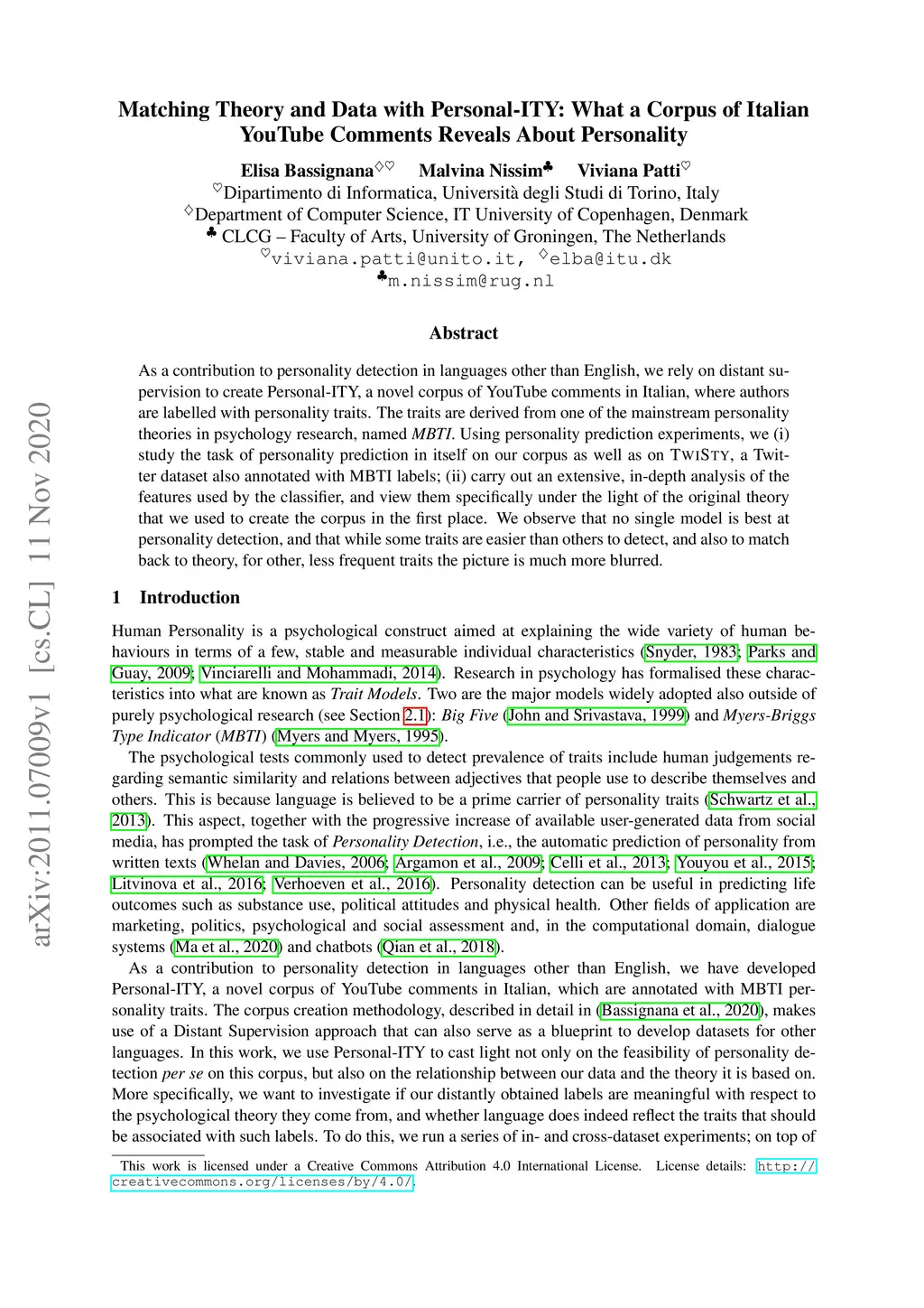As a contribution to personality detection in languages other than English, we rely on distant supervision to create Personal-ITY, a novel corpus of YouTube comments in Italian, where authors are labelled with personality traits. The traits are derived from one of the mainstream personality theories in psychology research, named MBTI. Using personality prediction experiments, we (i) study the task of personality prediction in itself on our corpus as well as on TwiSty, a Twitter dataset also annotated with MBTI labels; (ii) carry out an extensive, in-depth analysis of the features used by the classifier, and view them specifically under the light of the original theory that we used to create the corpus in the first place. We observe that no single model is best at personality detection, and that while some traits are easier than others to detect, and also to match back to theory, for other, less frequent traits the picture is much more blurred.