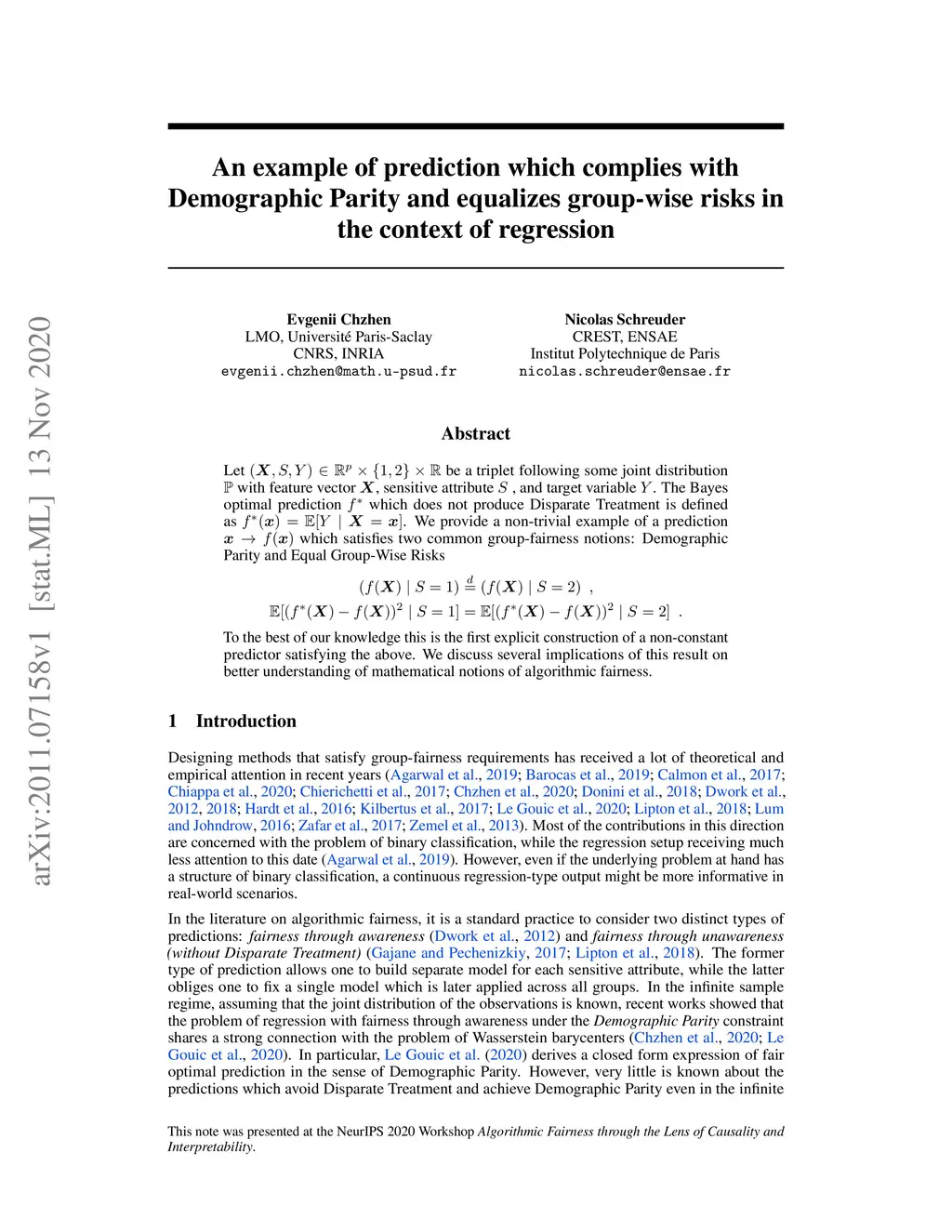 Let be a triplet following some joint distribution with feature vector , sensitive attribute , and target variable . The Bayes optimal prediction which does not produce Disparate Treatment is defined as . We provide a non-trivial example of a prediction which satisfies two common group-fairness notions: Demographic Parity \begin{align} (f(X) | S = 1) &\stackrel{d}{=} (f(X) | S = 2) \end{align} and Equal Group-Wise Risks \begin{align} \mathbb{E}[(f^*(X) - f(X))^2 | S = 1] = \mathbb{E}[(f^*(X) - f(X))^2 | S = 2]. \end{align} To the best of our knowledge this is the first explicit construction of a non-constant predictor satisfying the above. We discuss several implications of this result on better understanding of mathematical notions of algorithmic fairness.