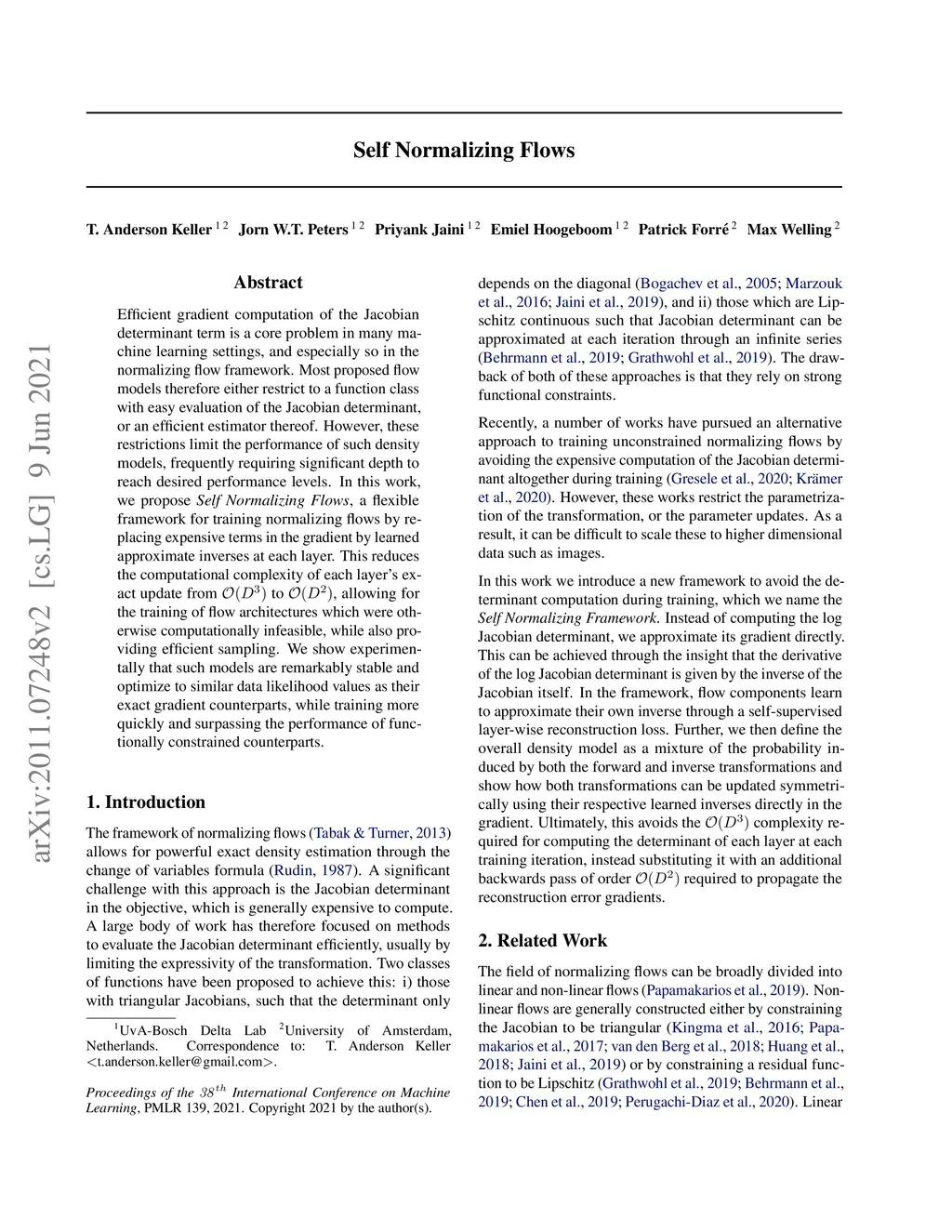 Efficient gradient computation of the Jacobian determinant term is a core problem in many machine learning settings, and especially so in the normalizing flow framework. Most proposed flow models therefore either restrict to a function class with easy evaluation of the Jacobian determinant, or an efficient estimator thereof. However, these restrictions limit the performance of such density models, frequently requiring significant depth to reach desired performance levels. In this work, we propose Self Normalizing Flows, a flexible framework for training normalizing flows by replacing expensive terms in the gradient by learned approximate inverses at each layer. This reduces the computational complexity of each layer's exact update from to , allowing for the training of flow architectures which were otherwise computationally infeasible, while also providing efficient sampling. We show experimentally that such models are remarkably stable and optimize to similar data likelihood values as their exact gradient counterparts, while training more quickly and surpassing the performance of functionally constrained counterparts.