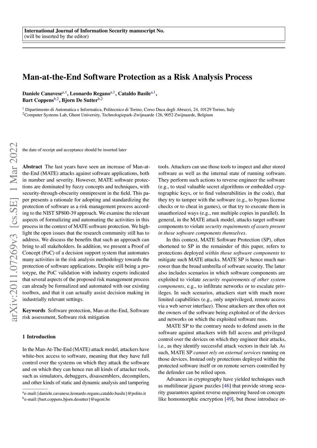 The last years have seen an increase of Man-at-the-End (MATE) attacks against software applications, both in number and severity. However, MATE software protections are dominated by fuzzy concepts and techniques, with security-through-obscurity omnipresent in the field. This paper presents a rationale for adopting and standardizing the protection of software as a risk management process according to the NIST SP800-39 approach. We examine the relevant aspects of formalizing and automating the activities in this process in the context of MATE software protection. We highlight the open issues that the research community still has to address. We discuss the benefits that such an approach can bring to all stakeholders. In addition, we present a Proof of Concept (PoC) of a decision support system that automates many activities in the risk analysis methodology towards the protection of software applications. Despite still being a prototype, the PoC validation with industry experts indicated that several aspects of the proposed risk management process can already be formalized and automated with our existing toolbox, and that it can actually assist decision making in industrially relevant settings