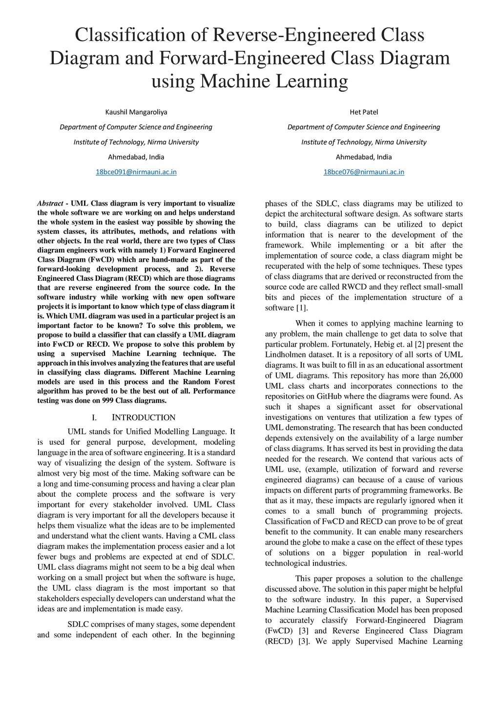 UML Class diagram is very important to visualize the whole software we are working on and helps understand the whole system in the easiest way possible by showing the system classes, its attributes, methods, and relations with other objects. In the real world, there are two types of Class diagram engineers work with namely 1) Forward Engineered Class Diagram (FwCD) which are hand-made as part of the forward-looking development process, and 2). Reverse Engineered Class Diagram (RECD) which are those diagrams that are reverse engineered from the source code. In the software industry while working with new open software projects it is important to know which type of class diagram it is. Which UML diagram was used in a particular project is an important factor to be known? To solve this problem, we propose to build a classifier that can classify a UML diagram into FwCD or RECD. We propose to solve this problem by using a supervised Machine Learning technique. The approach in this involves analyzing the features that are useful in classifying class diagrams. Different Machine Learning models are used in this process and the Random Forest algorithm has proved to be the best out of all. Performance testing was done on 999 Class diagrams.