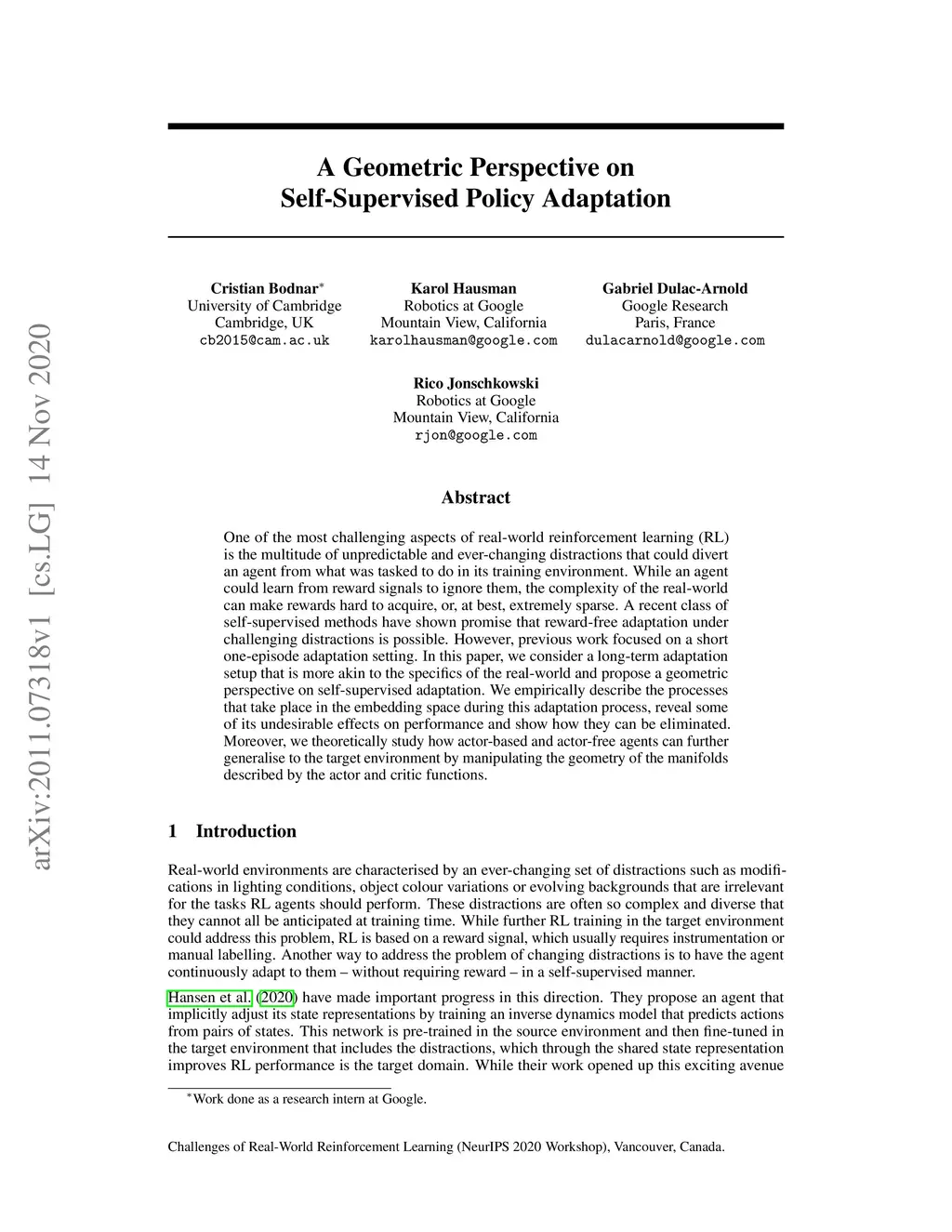 One of the most challenging aspects of real-world reinforcement learning (RL) is the multitude of unpredictable and ever-changing distractions that could divert an agent from what was tasked to do in its training environment. While an agent could learn from reward signals to ignore them, the complexity of the real-world can make rewards hard to acquire, or, at best, extremely sparse. A recent class of self-supervised methods have shown promise that reward-free adaptation under challenging distractions is possible. However, previous work focused on a short one-episode adaptation setting. In this paper, we consider a long-term adaptation setup that is more akin to the specifics of the real-world and propose a geometric perspective on self-supervised adaptation. We empirically describe the processes that take place in the embedding space during this adaptation process, reveal some of its undesirable effects on performance and show how they can be eliminated. Moreover, we theoretically study how actor-based and actor-free agents can further generalise to the target environment by manipulating the geometry of the manifolds described by the actor and critic functions.
