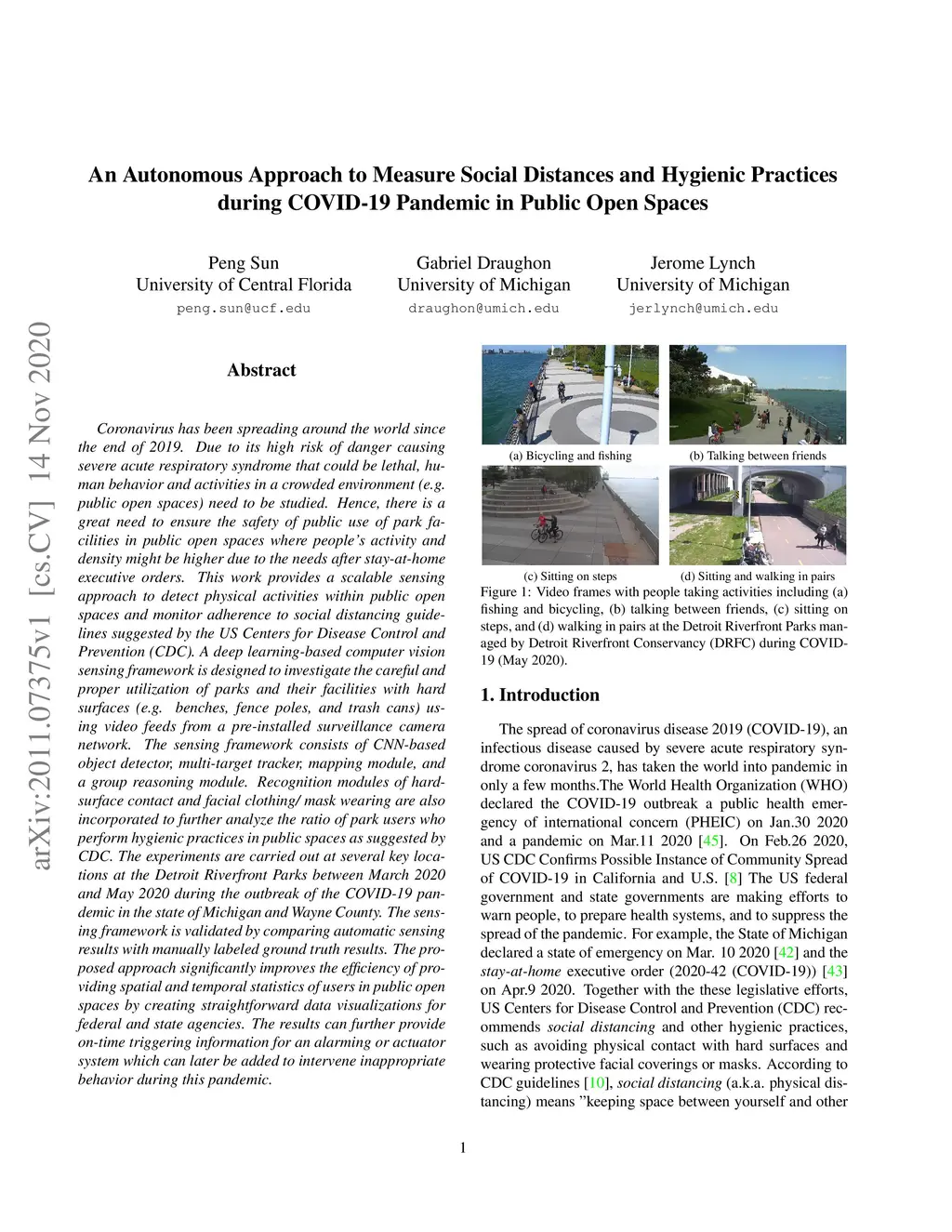 Coronavirus has been spreading around the world since the end of 2019. The virus can cause acute respiratory syndrome, which can be lethal, and is easily transmitted between hosts. Most states have issued state-at-home executive orders, however, parks and other public open spaces have largely remained open and are seeing sharp increases in public use. Therefore, in order to ensure public safety, it is imperative for patrons of public open spaces to practice safe hygiene and take preventative measures. This work provides a scalable sensing approach to detect physical activities within public open spaces and monitor adherence to social distancing guidelines suggested by the US Centers for Disease Control and Prevention (CDC). A deep learning-based computer vision sensing framework is designed to investigate the careful and proper utilization of parks and park facilities with hard surfaces (e.g. benches, fence poles, and trash cans) using video feeds from a pre-installed surveillance camera network. The sensing framework consists of a CNN-based object detector, a multi-target tracker, a mapping module, and a group reasoning module. The experiments are carried out during the COVID-19 pandemic between March 2020 and May 2020 across several key locations at the Detroit Riverfront Parks in Detroit, Michigan. The sensing framework is validated by comparing automatic sensing results with manually labeled ground-truth results. The proposed approach significantly improves the efficiency of providing spatial and temporal statistics of users in public open spaces by creating straightforward data visualizations for federal and state agencies. The results can also provide on-time triggering information for an alarming or actuator system which can later be added to intervene inappropriate behavior during this pandemic.