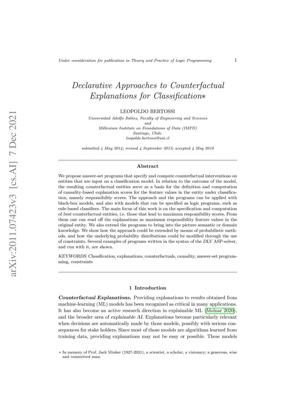 We propose answer-set programs that specify and compute counterfactual interventions on entities that are input on a classification model. In relation to the outcome of the model, the resulting counterfactual entities serve as a basis for the definition and computation of causality-based explanation scores for the feature values in the entity under classification, namely "responsibility scores". The approach and the programs can be applied with black-box models, and also with models that can be specified as logic programs, such as rule-based classifiers. The main focus of this work is on the specification and computation of "best" counterfactual entities, i.e. those that lead to maximum responsibility scores. From them one can read off the explanations as maximum responsibility feature values in the original entity. We also extend the programs to bring into the picture semantic or domain knowledge. We show how the approach could be extended by means of probabilistic methods, and how the underlying probability distributions could be modified through the use of constraints. Several examples of programs written in the syntax of the DLV ASP-solver, and run with it, are shown.
