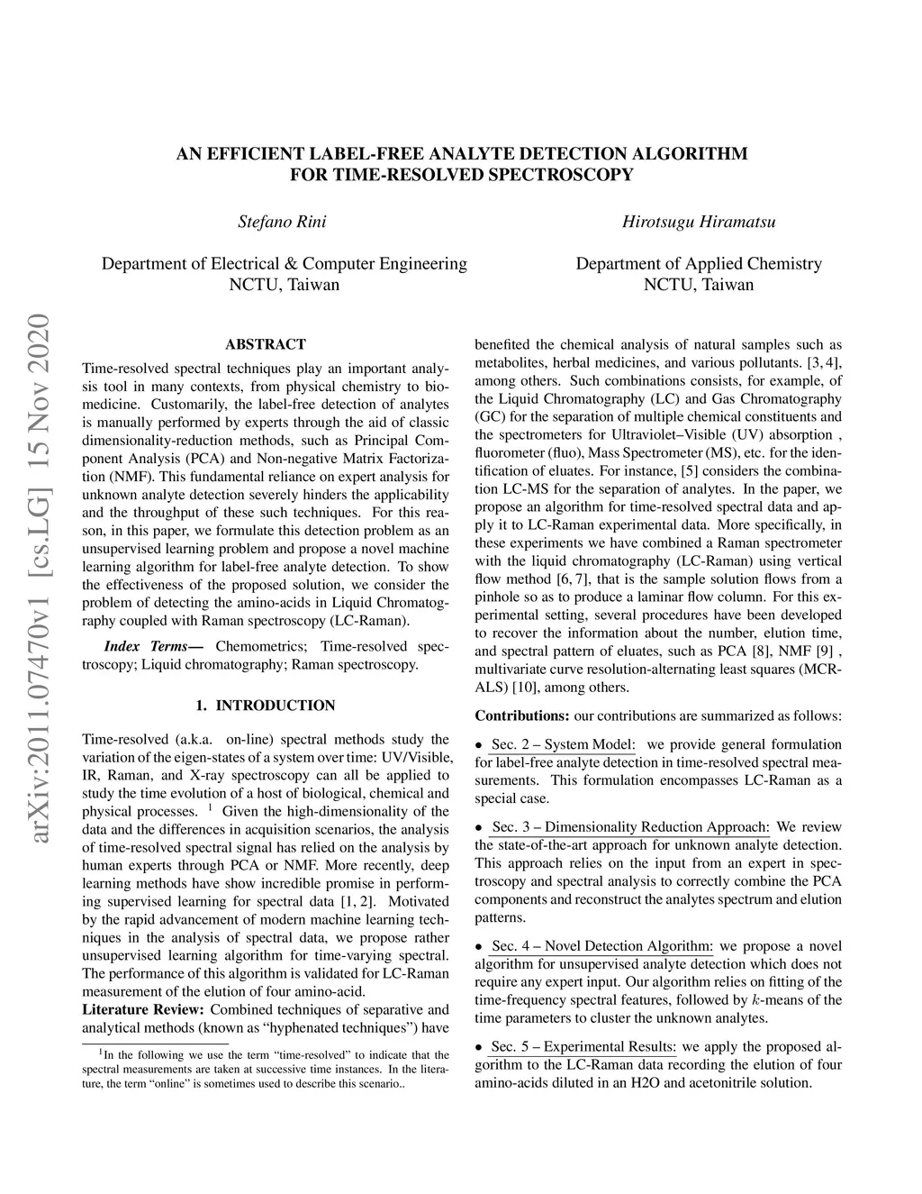 Time-resolved spectral techniques play an important analysis tool in many contexts, from physical chemistry to biomedicine. Customarily, the label-free detection of analytes is manually performed by experts through the aid of classic dimensionality-reduction methods, such as Principal Component Analysis (PCA) and Non-negative Matrix Factorization (NMF). This fundamental reliance on expert analysis for unknown analyte detection severely hinders the applicability and the throughput of these such techniques. For this reason, in this paper, we formulate this detection problem as an unsupervised learning problem and propose a novel machine learning algorithm for label-free analyte detection. To show the effectiveness of the proposed solution, we consider the problem of detecting the amino-acids in Liquid Chromatography coupled with Raman spectroscopy (LC-Raman).