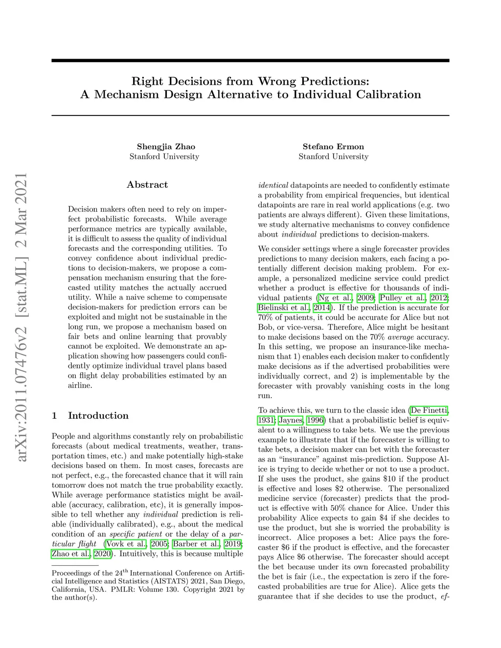 Decision makers often need to rely on imperfect probabilistic forecasts. While average performance metrics are typically available, it is difficult to assess the quality of individual forecasts and the corresponding utilities. To convey confidence about individual predictions to decision-makers, we propose a compensation mechanism ensuring that the forecasted utility matches the actually accrued utility. While a naive scheme to compensate decision-makers for prediction errors can be exploited and might not be sustainable in the long run, we propose a mechanism based on fair bets and online learning that provably cannot be exploited. We demonstrate an application showing how passengers could confidently optimize individual travel plans based on flight delay probabilities estimated by an airline.