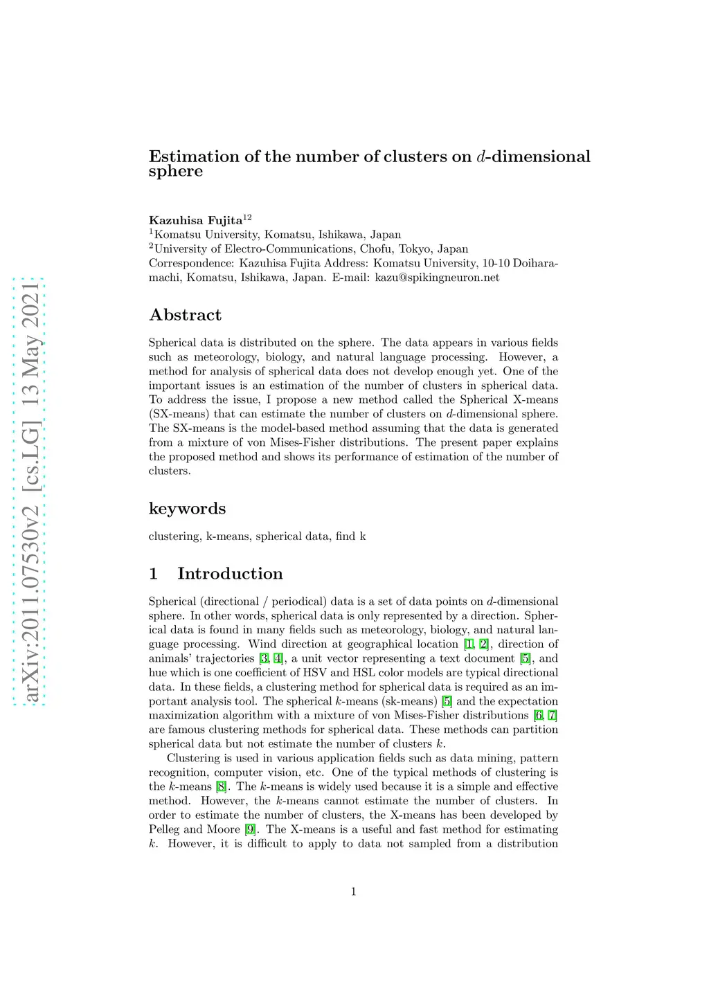 Spherical data is distributed on the sphere. The data appears in various fields such as meteorology, biology, and natural language processing. However, a method for analysis of spherical data does not develop enough yet. One of the important issues is an estimation of the number of clusters in spherical data. To address the issue, I propose a new method called the Spherical X-means (SX-means) that can estimate the number of clusters on d-dimensional sphere. The SX-means is the model-based method assuming that the data is generated from a mixture of von Mises-Fisher distributions. The present paper explains the proposed method and shows its performance of estimation of the number of clusters.
