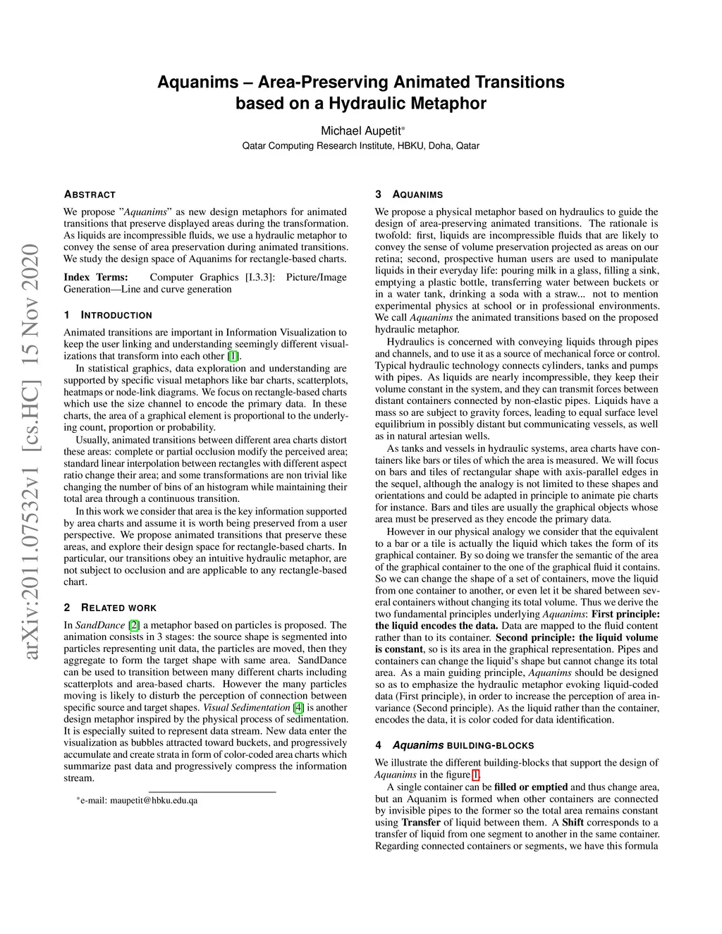 We propose "Aquanims" as new design metaphors for animated transitions that preserve displayed areas during the transformation. As liquids are incompressible fluids, we use a hydraulic metaphor to convey the sense of area preservation during animated transitions. We study the design space of Aquanims for rectangle-based charts.