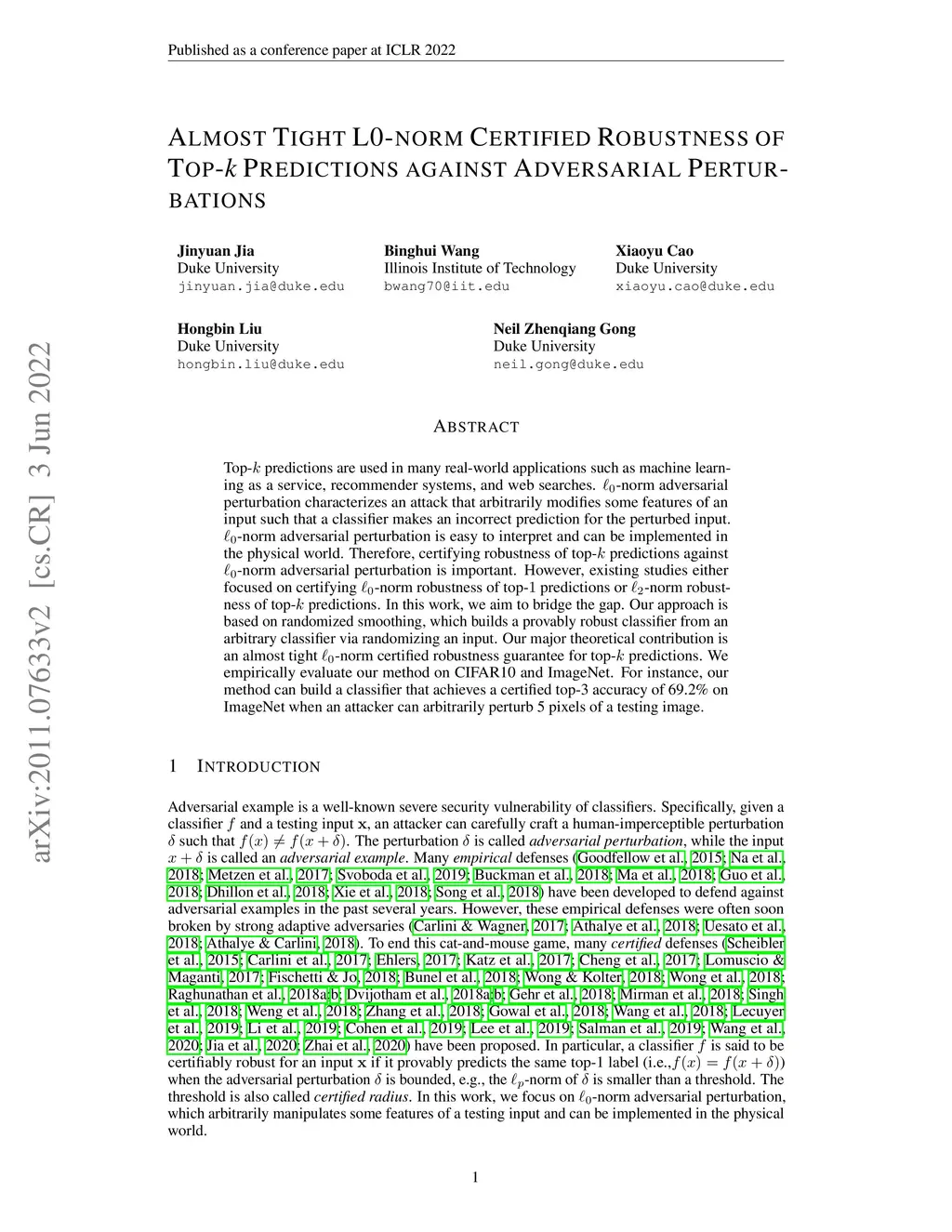 Top-k predictions are used in many real-world applications such as machine learning as a service, recommender systems, and web searches. -norm adversarial perturbation characterizes an attack that arbitrarily modifies some features of an input such that a classifier makes an incorrect prediction for the perturbed input. -norm adversarial perturbation is easy to interpret and can be implemented in the physical world. Therefore, certifying robustness of top- predictions against -norm adversarial perturbation is important. However, existing studies either focused on certifying -norm robustness of top- predictions or -norm robustness of top- predictions. In this work, we aim to bridge the gap. Our approach is based on randomized smoothing, which builds a provably robust classifier from an arbitrary classifier via randomizing an input. Our major theoretical contribution is an almost tight -norm certified robustness guarantee for top- predictions. We empirically evaluate our method on CIFAR10 and ImageNet. For instance, our method can build a classifier that achieves a certified top-3 accuracy of 69.2\% on ImageNet when an attacker can arbitrarily perturb 5 pixels of a testing image.