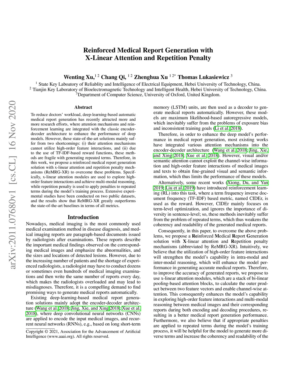 To reduce doctors' workload, deep-learning-based automatic medical report generation has recently attracted more and more research efforts, where attention mechanisms and reinforcement learning are integrated with the classic encoder-decoder architecture to enhance the performance of deep models. However, these state-of-the-art solutions mainly suffer from two shortcomings: (i) their attention mechanisms cannot utilize high-order feature interactions, and (ii) due to the use of TF-IDF-based reward functions, these methods are fragile with generating repeated terms. Therefore, in this work, we propose a reinforced medical report generation solution with x-linear attention and repetition penalty mechanisms (ReMRG-XR) to overcome these problems. Specifically, x-linear attention modules are used to explore high-order feature interactions and achieve multi-modal reasoning, while repetition penalty is used to apply penalties to repeated terms during the model's training process. Extensive experimental studies have been conducted on two public datasets, and the results show that ReMRG-XR greatly outperforms the state-of-the-art baselines in terms of all metrics.