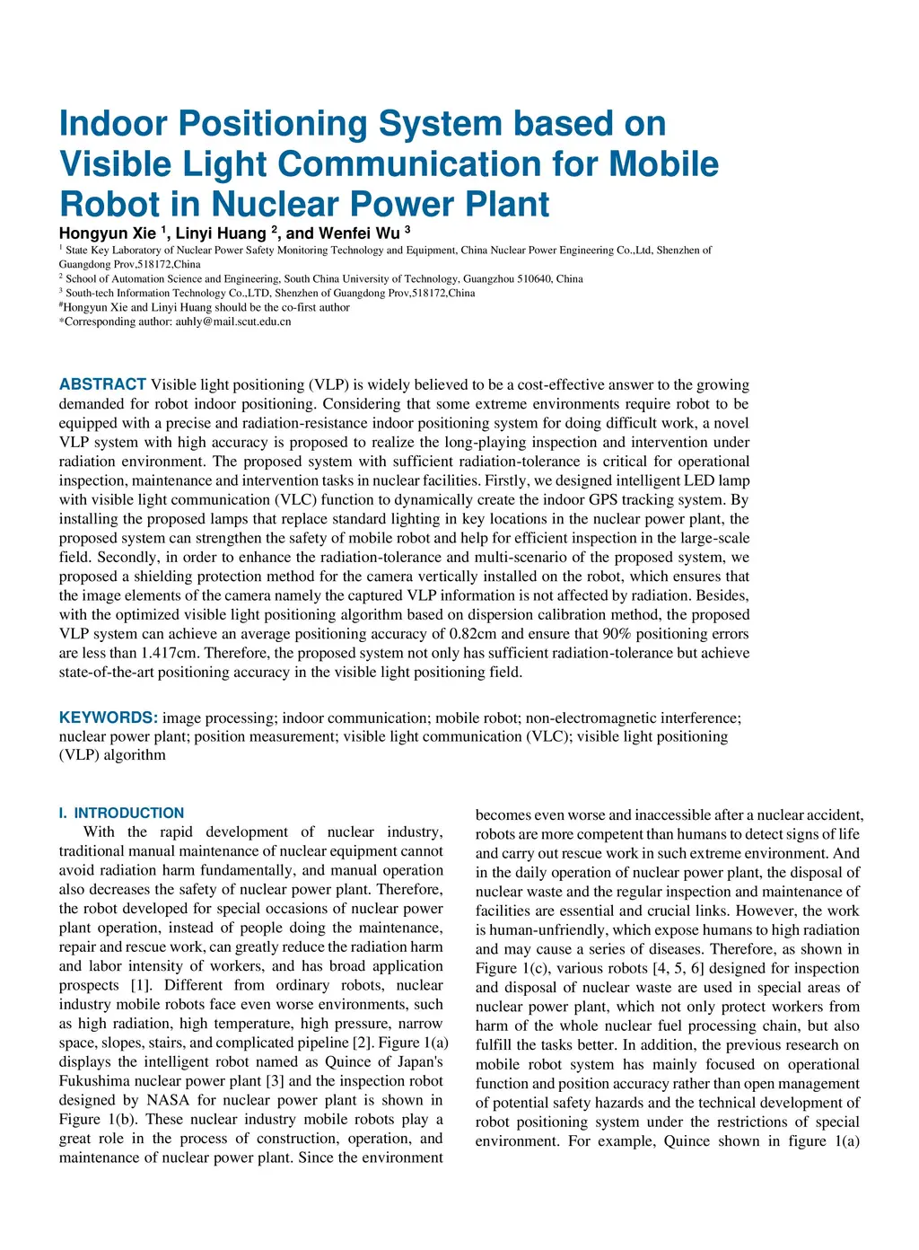 Visible light positioning (VLP) is widely believed to be a cost-effective answer to the growing demanded for robot indoor positioning. Considering that some extreme environments require robot to be equipped with a precise and radiation-resistance indoor positioning system for doing difficult work, a novel VLP system with high accuracy is proposed to realize the long-playing inspection and intervention under radiation environment. The proposed system with sufficient radiation-tolerance is critical for operational inspection, maintenance and intervention tasks in nuclear facilities. Firstly, we designed intelligent LED lamp with visible light communication (VLC) function to dynamically create the indoor GPS tracking system. By installing the proposed lamps that replace standard lighting in key locations in the nuclear power plant, the proposed system can strengthen the safety of mobile robot and help for efficient inspection in the large-scale field. Secondly, in order to enhance the radiation-tolerance and multi-scenario of the proposed system, we proposed a shielding protection method for the camera vertically installed on the robot, which ensures that the image elements of the camera namely the captured VLP information is not affected by radiation. Besides, with the optimized visible light positioning algorithm based on dispersion calibration method, the proposed VLP system can achieve an average positioning accuracy of 0.82cm and ensure that 90% positioning errors are less than 1.417cm. Therefore, the proposed system not only has sufficient radiation-tolerance but achieve state-of-the-art positioning accuracy in the visible light positioning field.