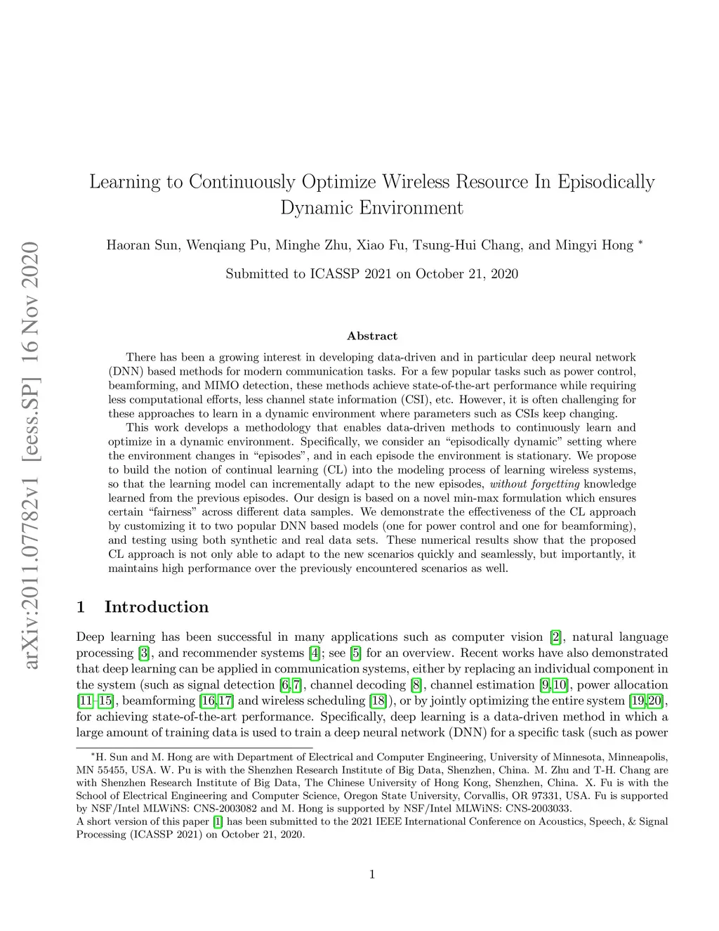 There has been a growing interest in developing data-driven and in particular deep neural network (DNN) based methods for modern communication tasks. For a few popular tasks such as power control, beamforming, and MIMO detection, these methods achieve state-of-the-art performance while requiring less computational efforts, less channel state information (CSI), etc. However, it is often challenging for these approaches to learn in a dynamic environment where parameters such as CSIs keep changing. This work develops a methodology that enables data-driven methods to continuously learn and optimize in a dynamic environment. Specifically, we consider an ``episodically dynamic" setting where the environment changes in ``episodes", and in each episode the environment is stationary. We propose to build the notion of continual learning (CL) into the modeling process of learning wireless systems, so that the learning model can incrementally adapt to the new episodes, {\it without forgetting} knowledge learned from the previous episodes. Our design is based on a novel min-max formulation which ensures certain ``fairness" across different data samples. We demonstrate the effectiveness of the CL approach by customizing it to two popular DNN based models (one for power control and one for beamforming), and testing using both synthetic and real data sets. These numerical results show that the proposed CL approach is not only able to adapt to the new scenarios quickly and seamlessly, but importantly, it maintains high performance over the previously encountered scenarios as well.